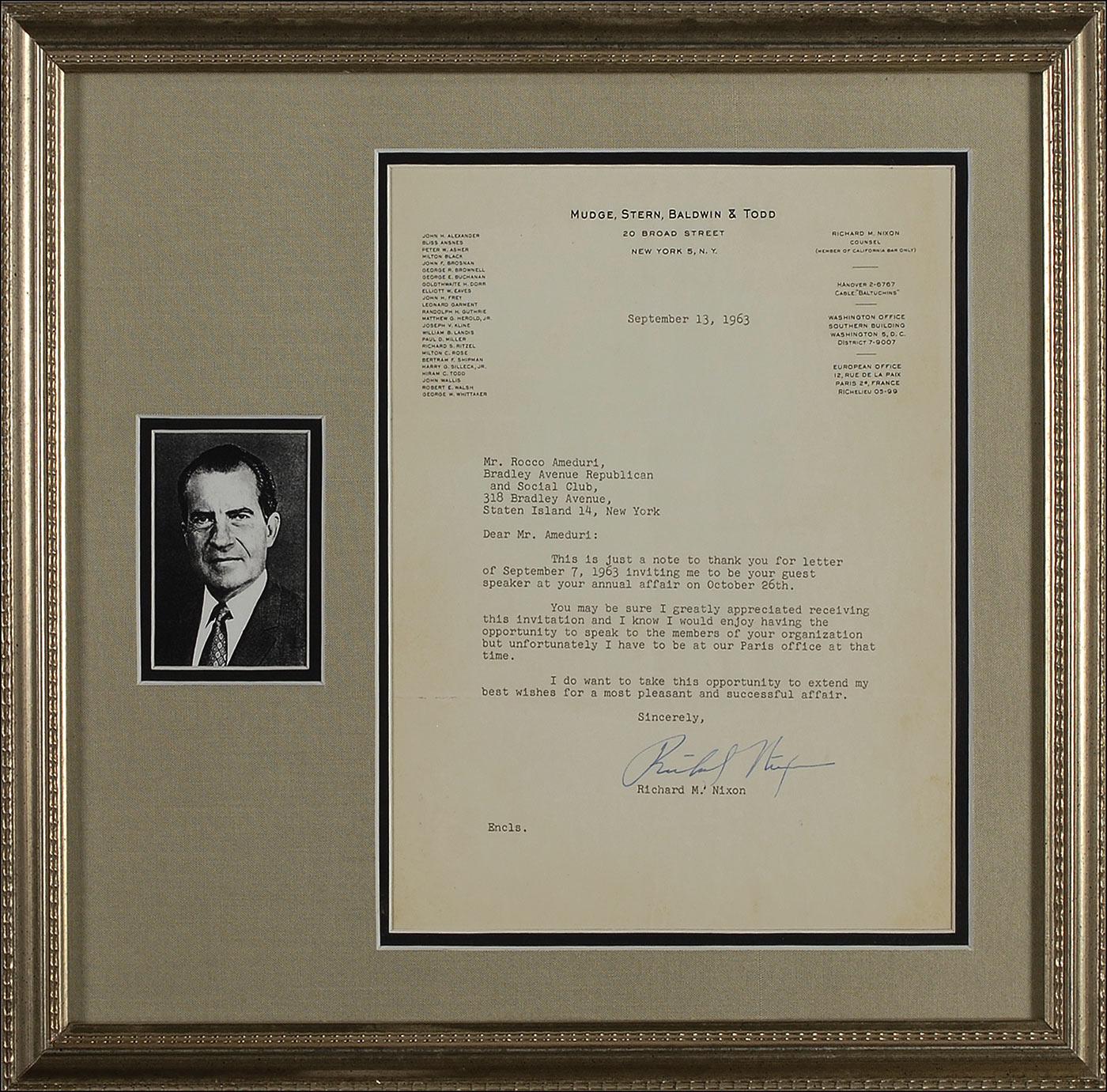 TLS, one page, 8.5 x 11, Mudge, Stern, Baldwin & Todd letterhead, September 13, 1963. Nixon turns down a speaking invitation from the Bradley Avenue Republican and Social Club. In part, “You may be sure I greatly appreciated receiving this invitation and I know I would enjoy the opportunity to speak to the members of your organization but unfortunately I have to be at our Paris office at that time.” Double cloth matted and framed with a small portrait to an overall size of 16.25 x 15. Light toning, a bit heavier at edges and some light creasing and wrinkling, otherwise fine condition. Pre-certified John Reznikoff/PSA/DNA and RRAuction COA.