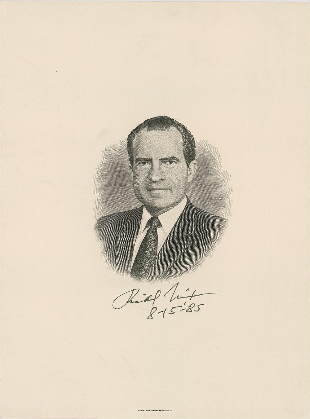 Engraved portrait of Nixon, 9 x 12, by the Bureau of Engraving and Printing, signed in black ink, “Richard Nixon 8-15-85.” In fine condition, with scattered creasing, primarily to the bottom border, which could be matted out. Pre-certified John Reznikoff/PSA/DNA and RRAuction COA.