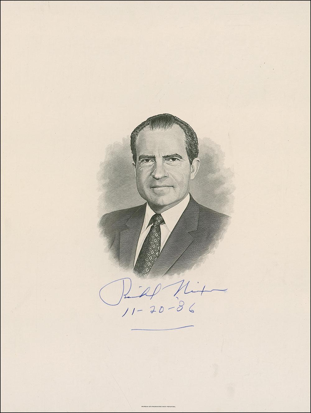 Engraved portrait of Nixon, 9 x 12, by the Bureau of Engraving and Printing, signed in blue ink, “Richard Nixon 11-20-86.” In very fine condition. Pre-certified John Reznikoff/PSA/DNA and RRAuction COA.