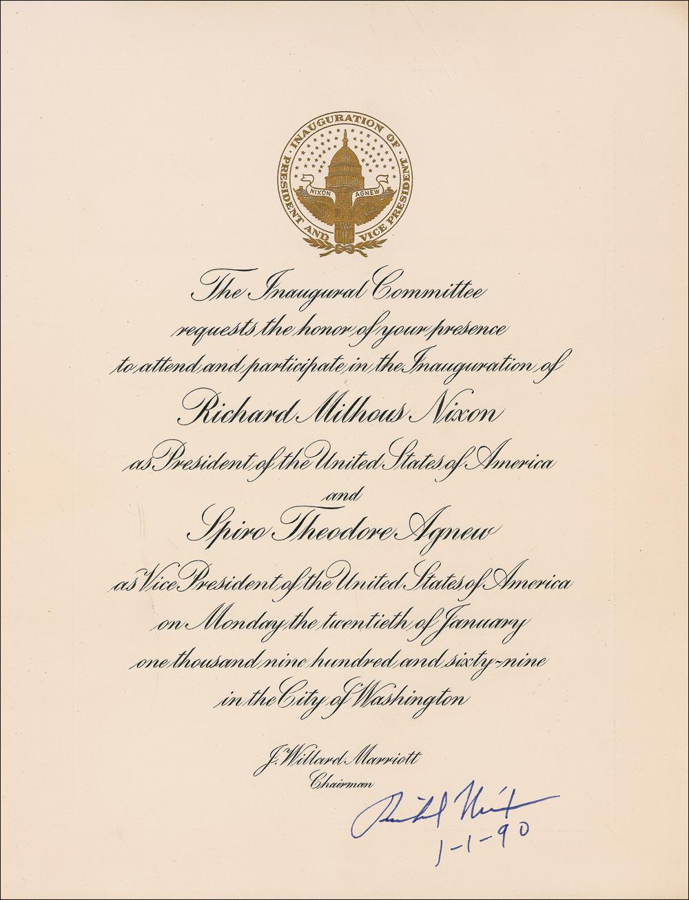 Nice embossed invitation to Nixon’s 1969 inauguration, 8.5 x 11, signed at the bottom in blue ink, “Richard Nixon 1-1-90.” In fine condition. Pre-certified John Reznikoff/PSA/DNA and RRAuction COA.