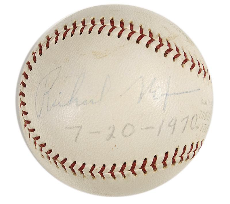 Official Reach American League baseball signed in blue ballpoint on a side panel, “Richard Nixon,” and dated in another hand under the signature, “7-20-1970,” which would indicate signature was obtained as president. In fine condition, with a uniform shade of mild toning, and some scattered light soiling, none affecting signature. Consignor notes he obtained the signature while serving as a New York Yankees bat boy. Pre-certified John Reznikoff/PSA/DNA and RRAuction COA.