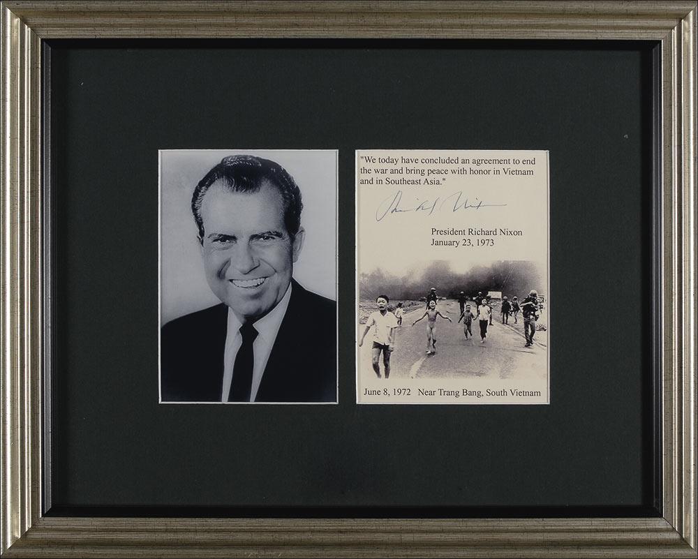 Blue ink signature, “Richard Nixon,” on an off-white 5.5 x 5.5 sheet, to which was later added a quote from President Nixon’s January 23, 1973, address, which reads, “We today have concluded an agreement to end the war and bring peace with honor in Vietnam in Southeast Asia.” Beneath the signature is a photo reproduction of the infamous bombing near Trang Bang in June 1972. Matted and framed with a portrait of Nixon, to an overall size of 14.5 x 11.75. In very fine condition.