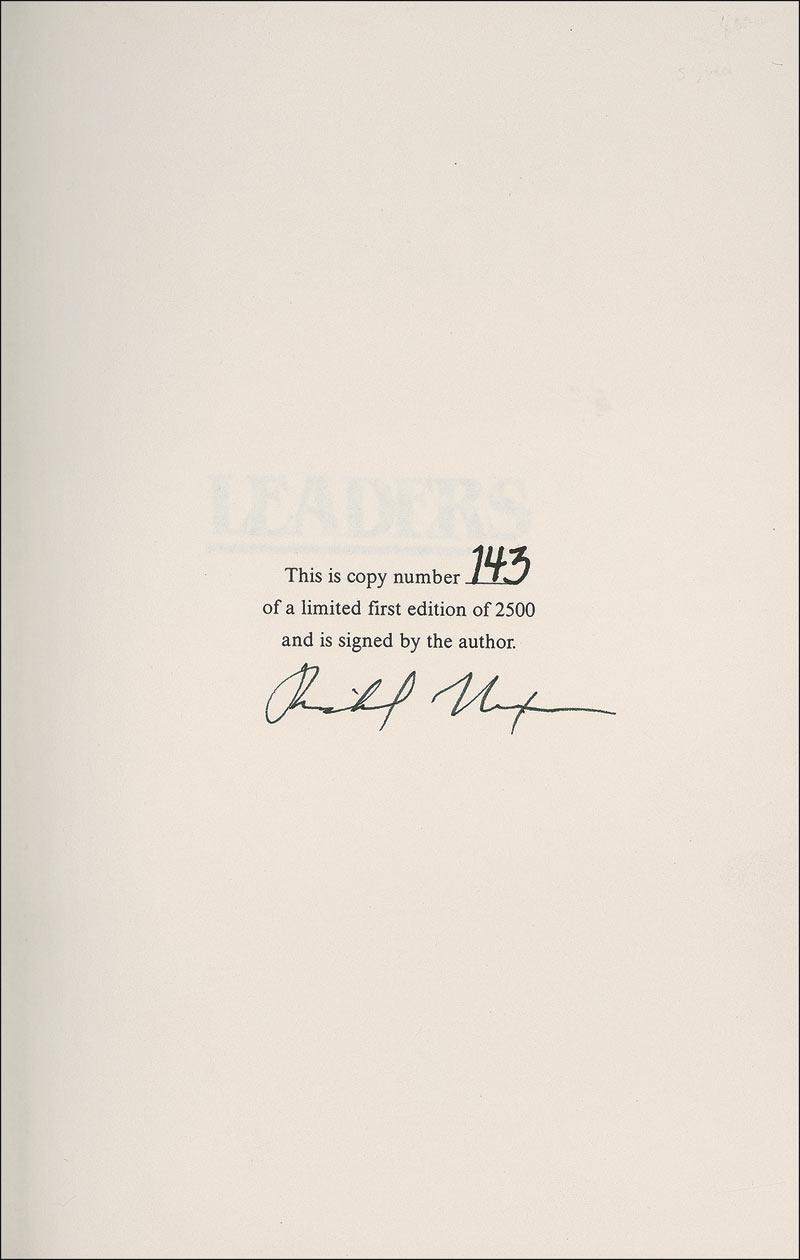 Signed book: Leaders. Limited first edition of 2500 copies (this copy No. 143). NY: Warner Books, 1982. Hardcover, 6.5 x 9.5, 371 pages. Signed in black ink on the limitations page. In very fine condition.