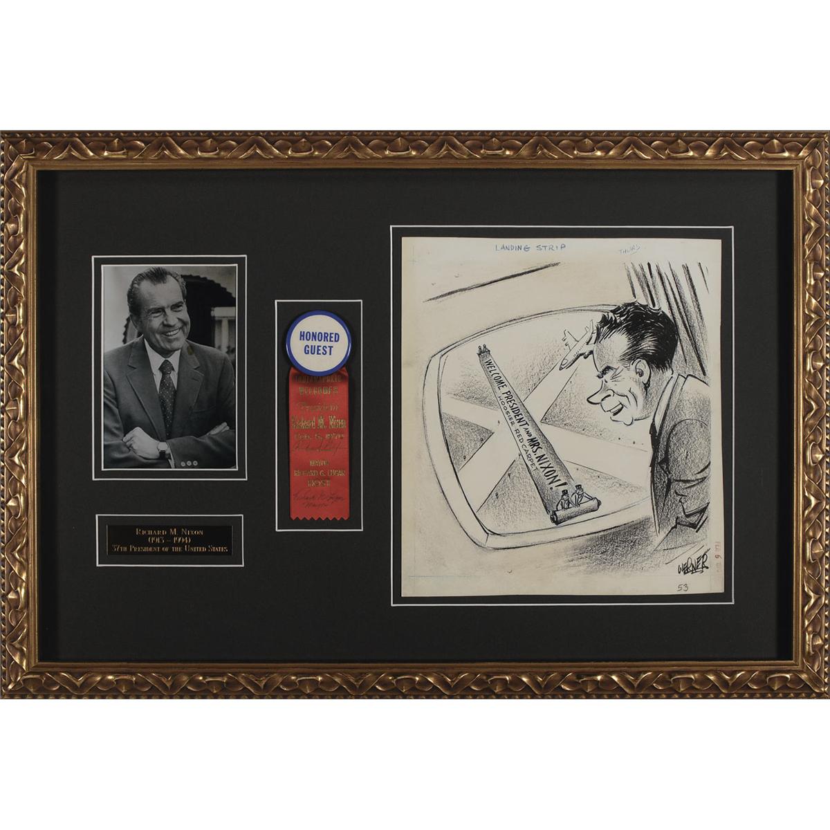 Original “honored guest” red, white, and blue campaign pin, 2.25 x 7, for Nixon’s February 5, 1970, presidential visit to Indianapolis, signed on the red portion of the ribbon “Richard Nixon,” and also signed by then Indianapolis mayor (now senator) Richard G. Lugar. Also included is the original Charles Werner charcoal 11 x 11.5 political cartoon, also dated February 5, 1970, depicting Nixon’s arrival and welcome in Indianapolis. Both are archivally matted and framed together with a small photo of Nixon and a name plaque, to an overall size of 28 x 19. In fine condition. Oversized.