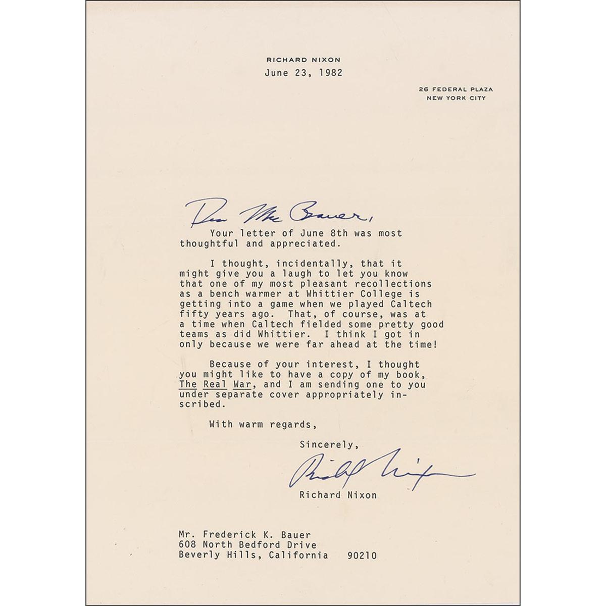 TLS, one page, 7.25 x 10, personal letterhead, June 23, 1982. Letter to an admirer, with Nixon handwriting the greeting at the top, recounting a college baseball game. In part: “I thought, incidentally, that it might give you a laugh to let you know that one of my most pleasant recollections as a bench warmer at Whittier College is getting into a game when we played Caltech fifty years ago. That, of course, was at a time when Caltech fielded some pretty good teams as did Whittier. I think I got in only because we were far ahead at the time!” In fine condition, with a trimmed lower edge.