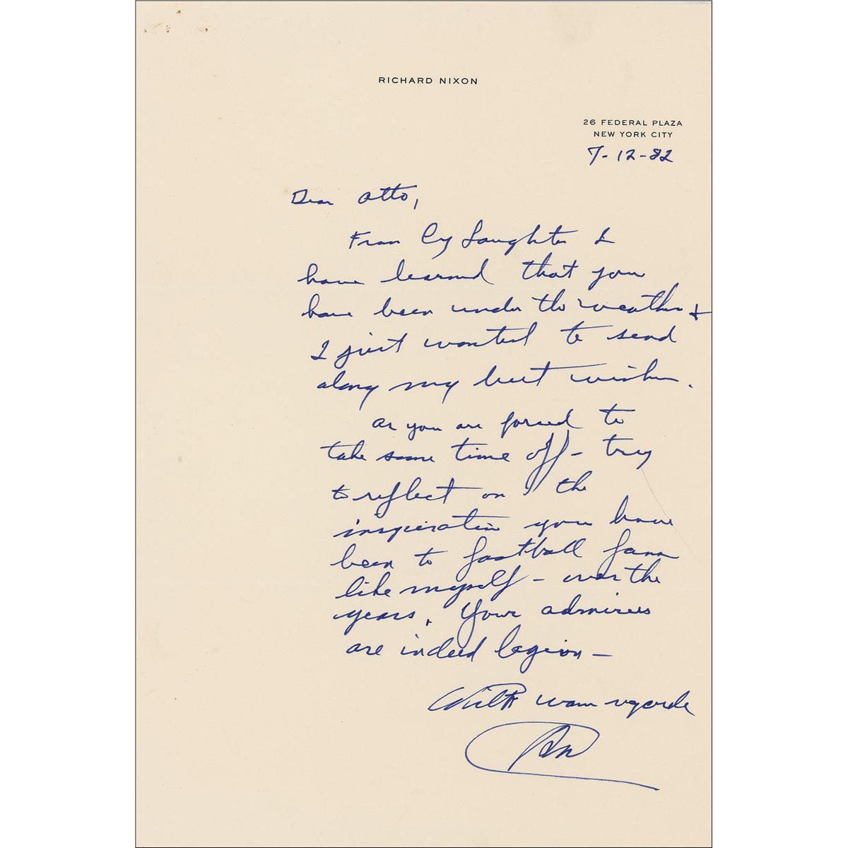 ALS signed “RN,” one page, 7.25 x 10.5, personal letterhead, July 12, 1982. Nixon sends get well wishes to football great Otto Graham. In part: “As you are forced to take some time off–try to reflect on the inspiration you have been to football fans like myself–over the years. Your admirers are indeed legion.” In fine condition, with staple holes to top left corner. Accompanied by the original mailing envelope.
