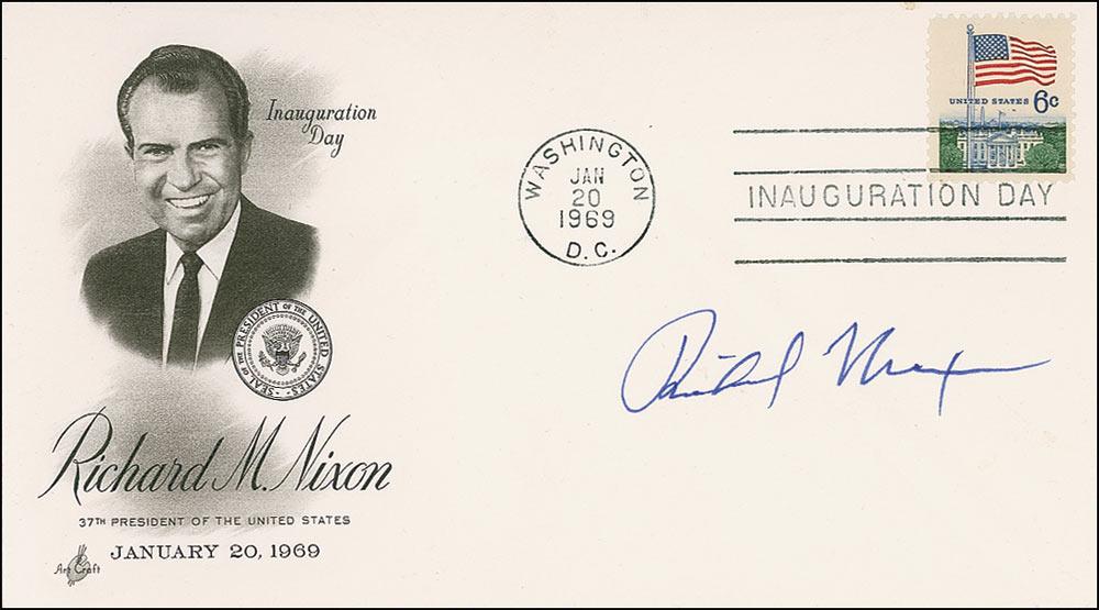 Inauguration Day cover with a cachet honoring Richard Nixon on his swearing in as the 37th president of the United States, signed in blue felt tip. In fine condition. Inauguration Day covers are produced only once every four years, making them scarcer than FDCs.