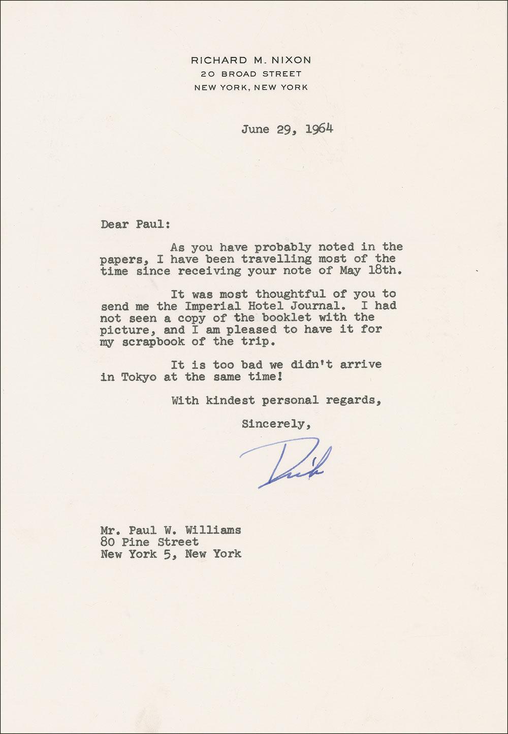 TLS signed “Dick,” one page, 7.25 x 10.5, personal letterhead, June 29, 1964. In part: “It was most thoughtful of you to send me the Imperial Hotel Journal. I had not seen a copy of the booklet with the picture, and I am pleased to have it for my scrapbook of the trip. It is too bad we didn’t arrive in Tokyo at the same time!” In fine condition, with a small spot of soiling not affecting the text.