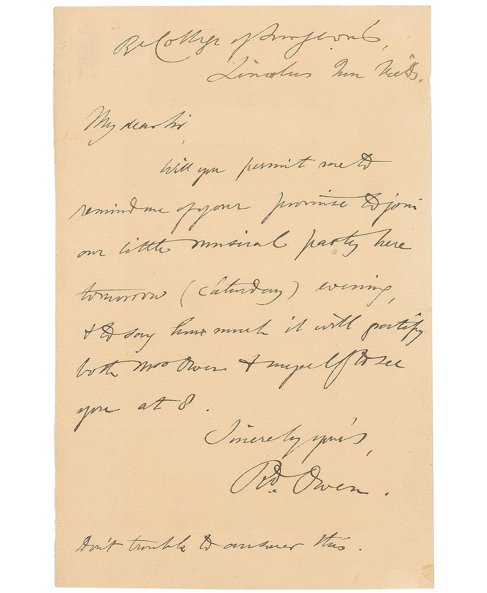 English biologist and paleontologist (1804–1892) best known for interpreting fossils and coining the term ‘dinosaur.’ ALS signed “Rd. Owen,” one page, 4.25 x 6.75, no date. Letter to a friend, in full: “Will you permit me to remind me of your promise to join our little musical party here tomorrow (Saturday) evening, & to say how much it will gratify both Mrs. Owen and myself to see you at 8.” Owen adds a brief postscript at the conclusion, “Don’t trouble to answer this.” In fine condition, with a trivial ding to upper right edge.
