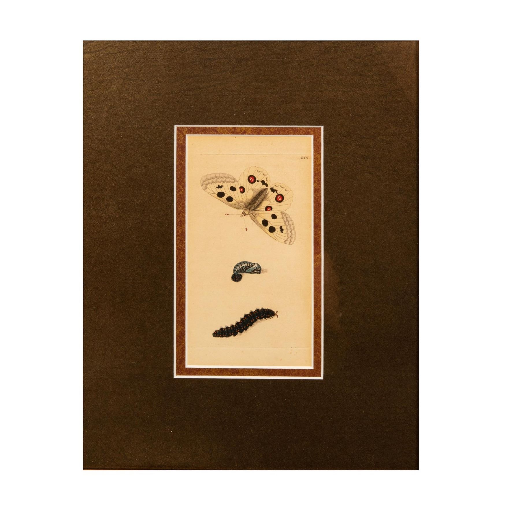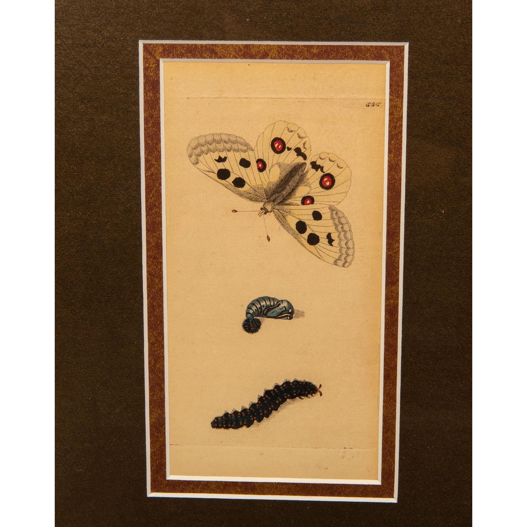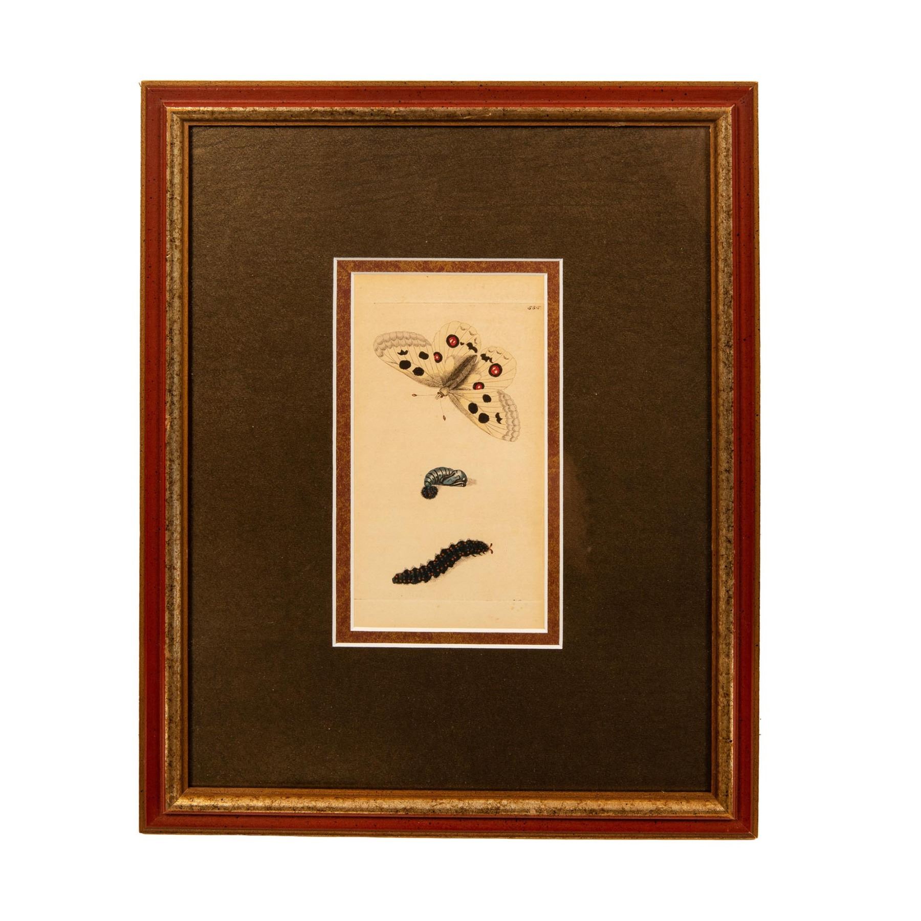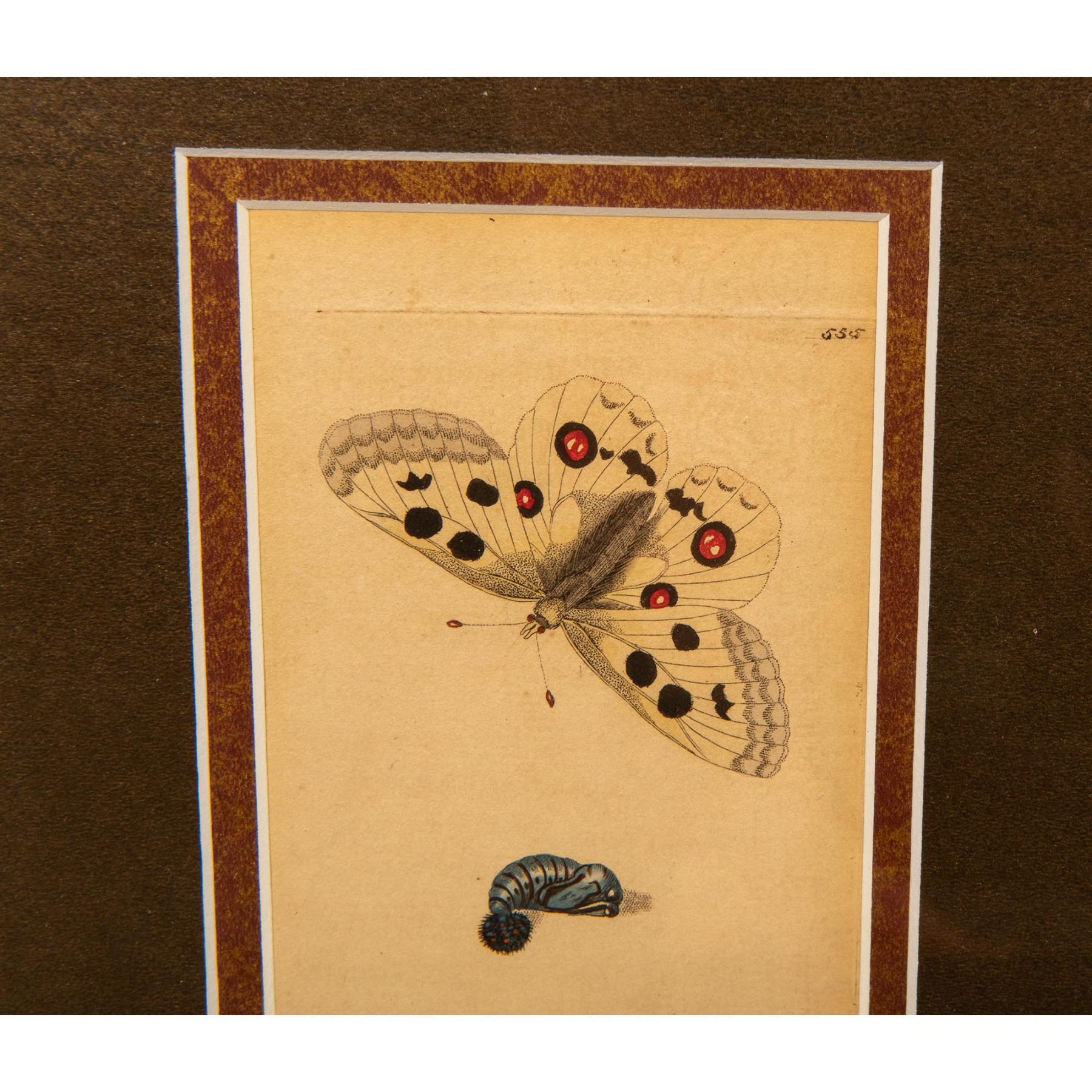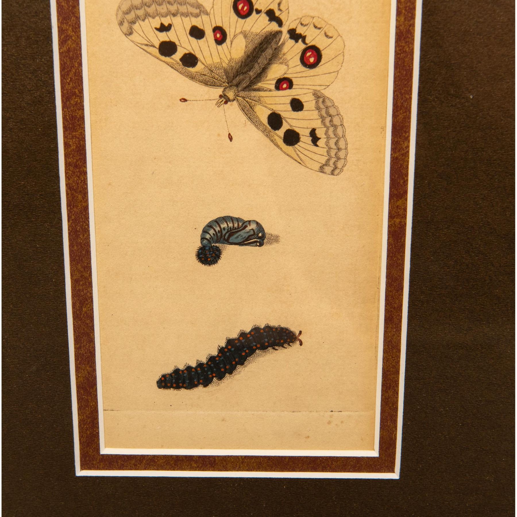 Original hand colored engraving by Richard Polydore Nodder of the Apollo butterfly (Parnassuis Apollo) with caterpillar and pupa from George Shaw's The Naturalist's Miscellany (or Coloured Figures of Natural Objects) 1789-1813 published by Nodder & amp; Company, London. 555. Housed in a marbleized wood frame and brown mat. Sight size: 3.50"L x 7"H. Frame size: 11.50"L x 15"H x 0.50"D.