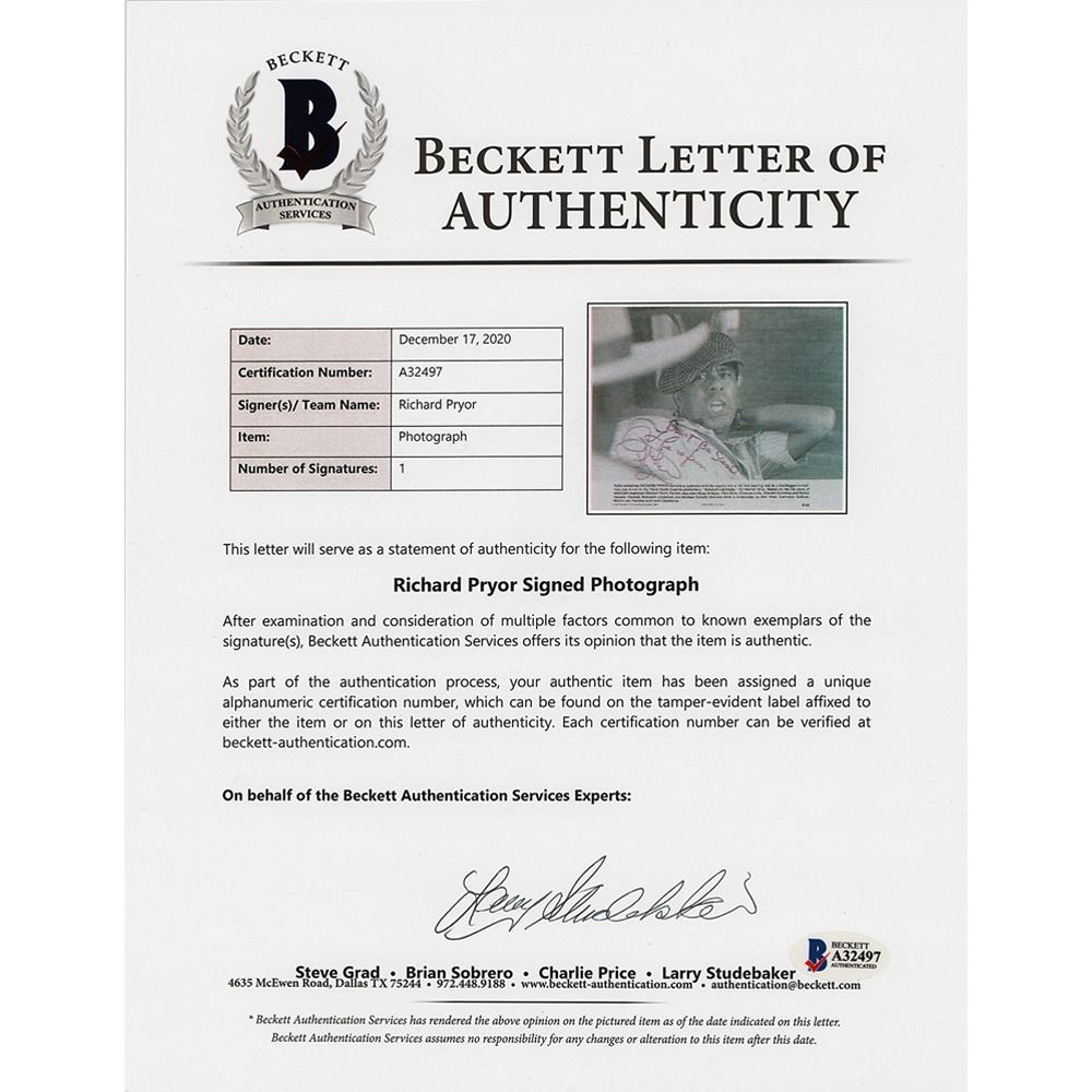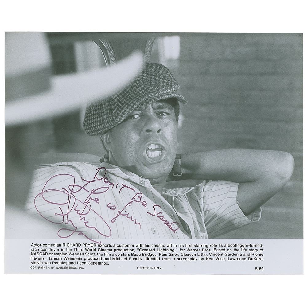 Uncommon glossy 9.5 x 7.5 Warner Bros. publicity photo of Pryor as Wendell Scott in the 1977 film Greased Lightning, signed in black felt tip, "Don't be scared, Life is fun, Richard Pryor." In fine condition. Accompanied by a full letter of authenticity from Beckett Authentication Services.
