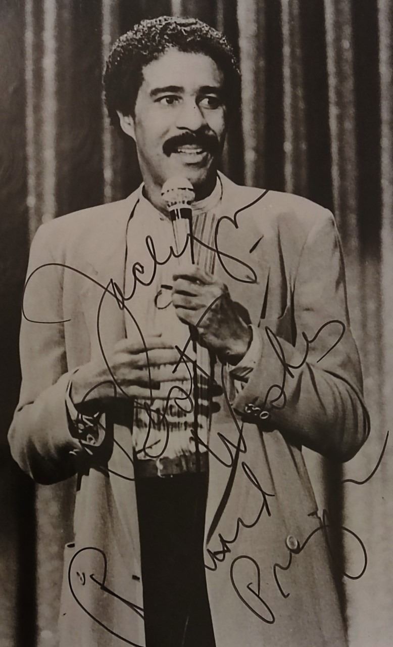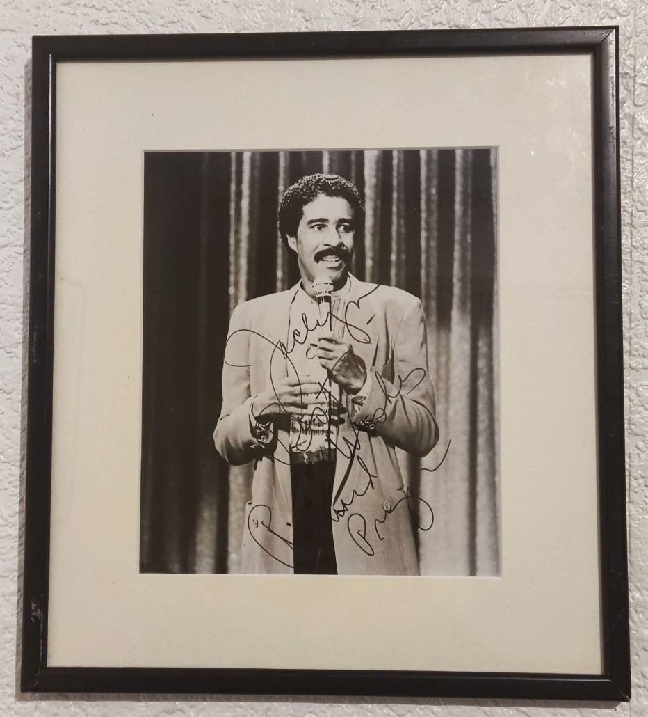 A Richard Pryor on stage signed and dedicated photo. Size of photo: 8.75x7.5 inches. Mounted and framed. Richard Pryor reached a broad audience with his trenchant observations and storytelling style, and is widely regarded as one of the greatest and most influential stand-up comedians of all time.