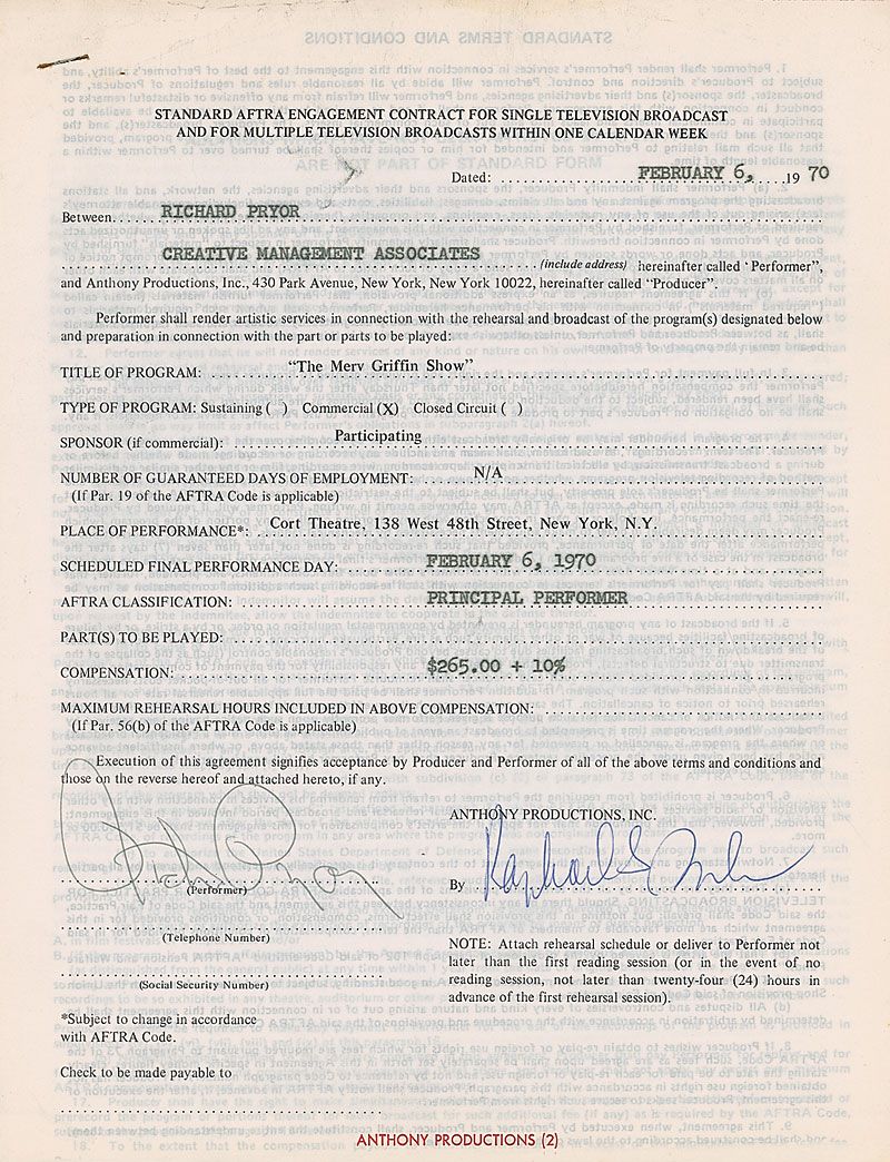DS, one page, 8.5 x 11, February 6, 1970. Standard AFTRA contract in which Pryor agrees to appear on The Merv Griffin Show on the same day in exchange for $265 plus a 10% agency commission. Signed at the conclusion in ballpoint by Pryor. A standard AFTRA rider is stapled to the main document in the upper left. In fine condition, with expected document wear.