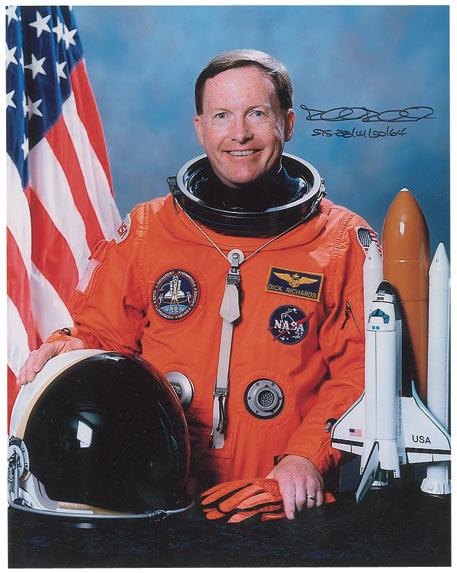 Color glossy 8 x 10 photo of Richards in his orange spacesuit posing with his helmet, gloves, and a model shuttle, signed in black felt tip, “Richard Richards, STS 28/41/50/64.” In very fine condition.