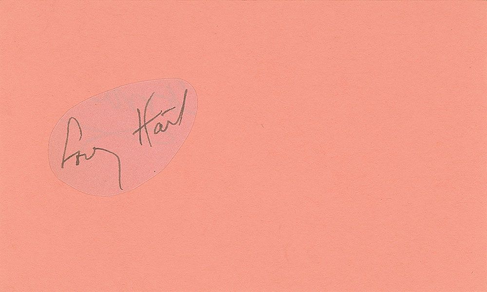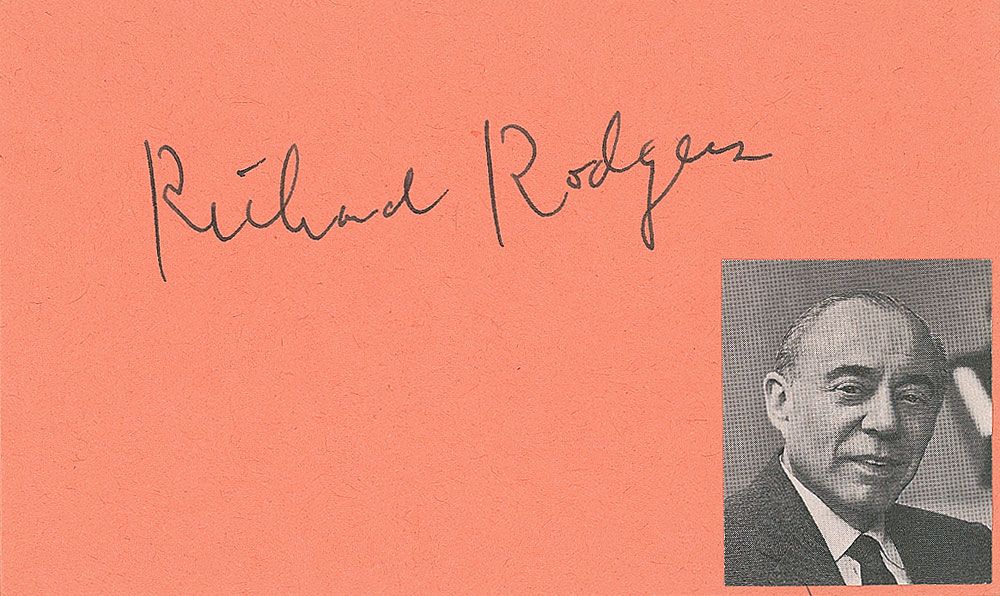 Two signatures: one fountain pen signature, “Richard Rodgers,” on a pink 5 x 3 card with affixed book photo; and one vintage fountain pen signature, “Lorenz Hart,” on a clipped pink slip affixed to a pink 5 x 3 card. In fine condition.