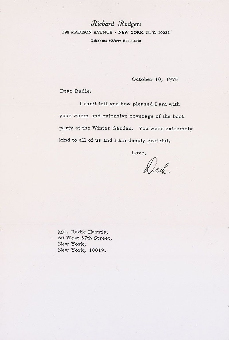 TLS signed “Dick,” one page, 7.25 x 10.5, personal letterhead, October 10, 1975. Letter to journalist Radie Harris. In full: “I can’t tell you how pleased I am with your warm and extensive coverage of the book party at the Winter Garden. You were extremely kind to all of us and I am deeply grateful.” In fine condition, with a couple trivial creases to the top.
