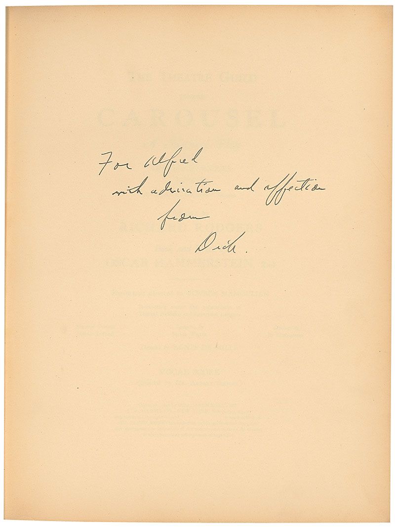 Signed book: Carousel. NY: T. B. Harms, 1945. Hardcover, 9.25 x 12, 190 pages. Signed and inscribed on the first free end page in black felt tip, “For Alfred, with admiration and affection, from, Dick.” Some separations to cover of the spine (binding remains strong), and scattered surface loss to lettering on the front cover, otherwise fine condition.