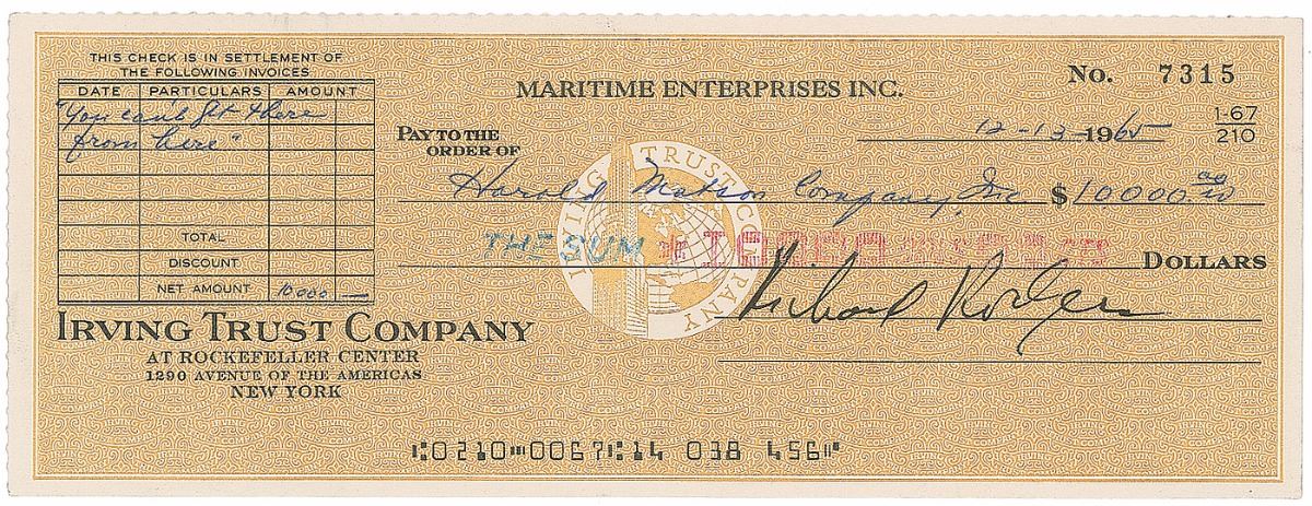Business check, 8.25 x 3, filled out in another hand and signed by Rodgers, payable to Harold Matson Company for $10,000, December 13, 1965. The memo field notes that the check was for "You Can't Get There From Here.” In fine condition.