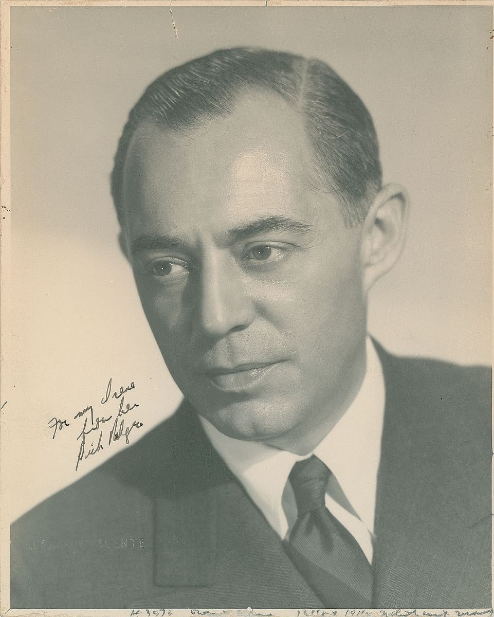 Vintage matte-finish 8 x 10 close-up portrait of the acclaimed American composer, signed and inscribed in fountain pen, “For my Irene, from her Dick Rodgers.” Blindstamped in the lower left by the photographer Alfredo Valente. In very good to fine condition, with trimmed borders, a tear to the top edge, and old mounting remnants on the reverse. Irene Gallagher was an executive for the Chappell Music Co., who worked with Rodgers and other composers for over four decades.