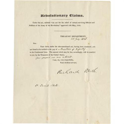 <B>Richard Rush 1828 Document Signed as Secretary of the Treasury</B></I> “<I>Richard Rush</B></I>”. One page, 7.75” x 10”, on printed Treasury Department document, dated July 25, 1828. A document signed by Secretary of the Treasury Richard Rush (1780-1859) approving a claim of service in the Revolutionary War. The claimant, Dr. Daniel Shute, was found to be entitled to the pay of a Captain of Infantry. The document has the usual fold creases, but Rush's signature is boldly writ and the document is in fine condition. <BR><BR><b>Shipping:</b> Flat Material, Small (<a target="_blank" href="http://www.heritageauctions.com/common/shipping.php">view shipping information</a>)