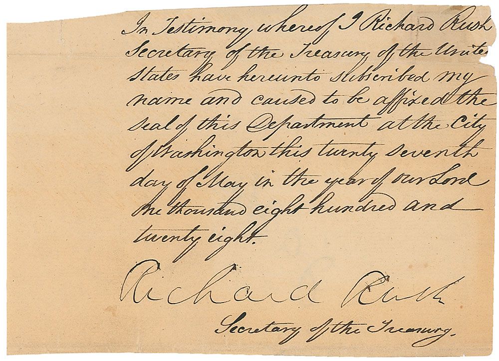 Manuscript DS, one page, 5.25 x 3.75, May 7, 1828. Partial self-contained document in which Secretary of the Treasury Rush confirms that he has affixed the seal of the Treasury Department to the document. In very good condition, with a horizontal fold and small tear to the top, scattered toning, a trimmed top edge, a ding to the right edge, and some show-through from mounting remnants.