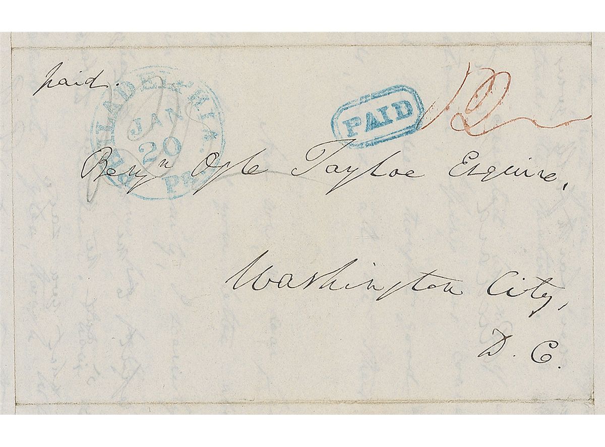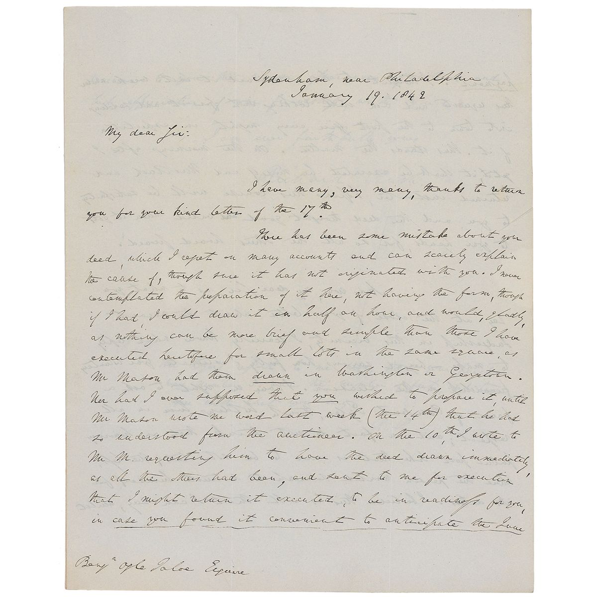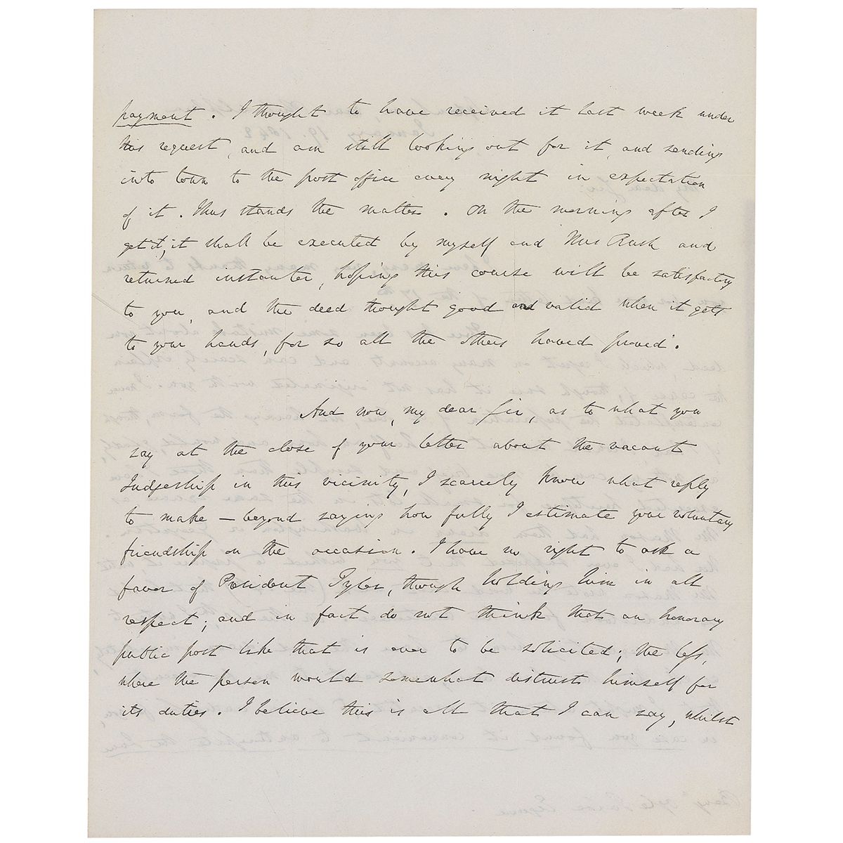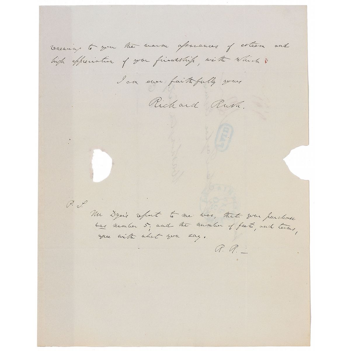 Son of signer Benjamin Rush (1780–1859), he helped bring about the Monroe Doctrine. ALS, three pages on two adjoining sheets, 8 x 10, January 19, 1842. Letter to Benjamin Taylor. In part: “There has been some mistake about your deed, which I regret on many accounts and can scarcely explain the cause of, though sure it has not originated with you. I never contemplated the preparation of it here, not having the form, though if I had, I could draw it in half an hour…And now, my dear Sir, as to what you say at the close of your letter about the vacant judgeship in this vicinity, I scarcely know what reply to make—beyond saying how I fully estimate your voluntary friendship on the occasion. I have no right to ask a favor of President Tyler, though holding him in all respect.” Rush also adds a short postscript on the following page, signed “R. R.” revere of second integral page is addressed in Rush’s hand. In fine condition, with intersecting folds, mounting remnant along reverse of second page, and two small areas of paper loss from wax seal.