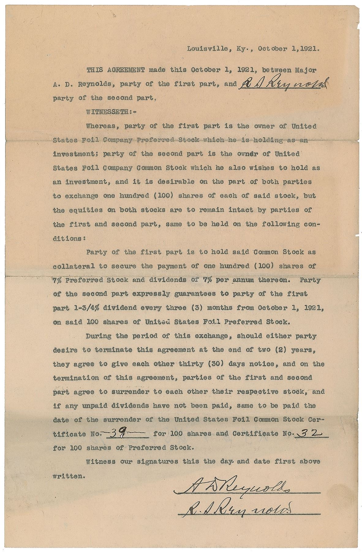 Nephew (1881–1955) of tobacco magnate R. J. Reynolds, who made his own name as the founder of the US Foil Company; today, his company's 'Reynolds Wrap' aluminum foil is a ubiquitous household good. DS, signed twice, "R. S. Reynolds," one page, 8.5 x 13, October 21, 1921. Document concluded at Louisville, Kentucky, by which Abram D. Reynolds and Richard S. Reynolds exchange 100 shares in the United States Foil Company. Signed in the body and at the conclusion by Richard S. Reynolds, Sr., and his uncle, Major Abram D. Reynolds. In fine condition.
