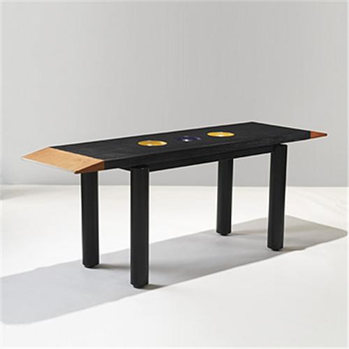 Three bowls are carved into the top of the wooden slab using primitive tools and techniques, giving the surface dual functions. The tabletop is presented like an object as it rests on a base fashioned like a museum stand. Signed, titled and dated to side.