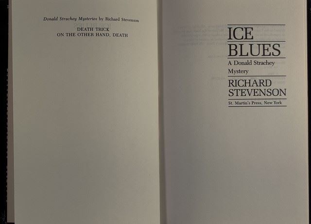 Ice Blues (St. Martin's Press, 1986) first edition hard cover book, signed by author Richard Stevenson. 212 pages. ISBN: 0-312-40379-8.