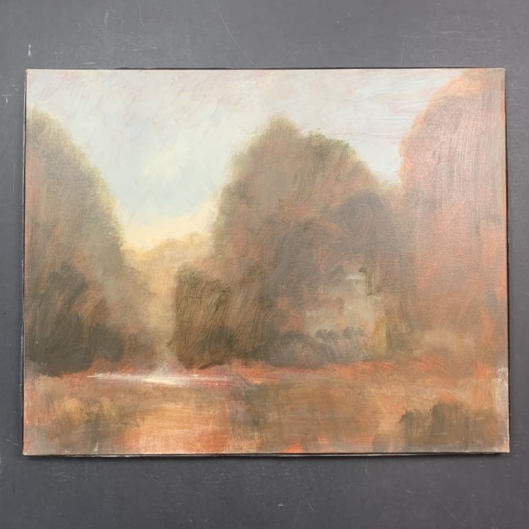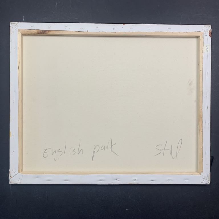 Richard Stipl's "English Park" Original Landscape on Canvas. The clearing in this forest seems to have a small pond. This piece is signed and titled on the back and is in excellent condition