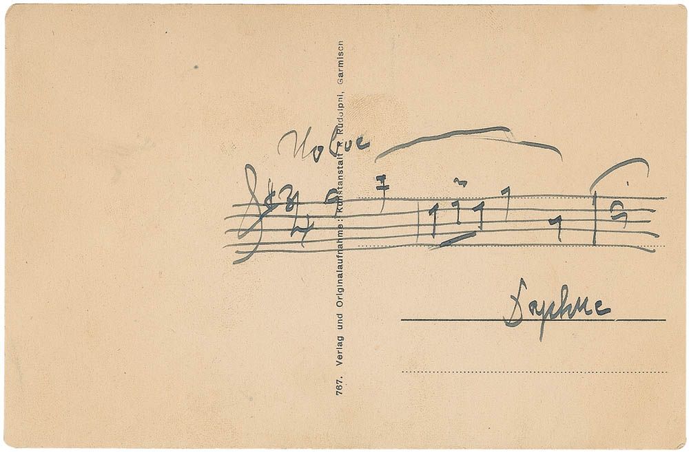Vintage 5.5 x 3.5 postcard photo of Strauss at his home in Garmisch, signed and inscribed in the borders in fountain pen “Mr. Plung, Dr. Richard Strauss, 26.6.43.” On the reverse is a three-bar AMQS, which Strauss identifies as being from his one-act opera “Daphne.” Mild scattered creases and soiling, and some light stray ink to the upper left, otherwise fine condition. Accompanied by an original unsigned postcard portrait of Strauss.