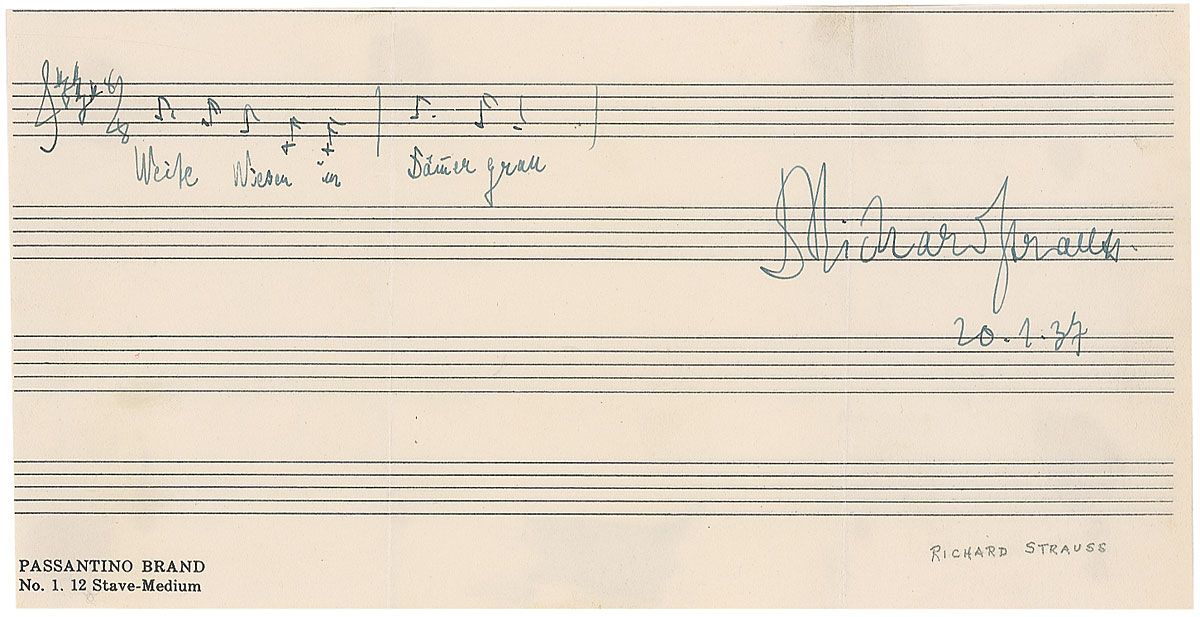 AMQS on an off-white 8.5 x 4.5 musically-lined sheet. Strauss pens two bars of music and lyrics to an unidentified work, and signs in the lower right, “Richard Strauss 20.1.37.” Two vertical folds, one through a single letter of signature, lightly trimmed