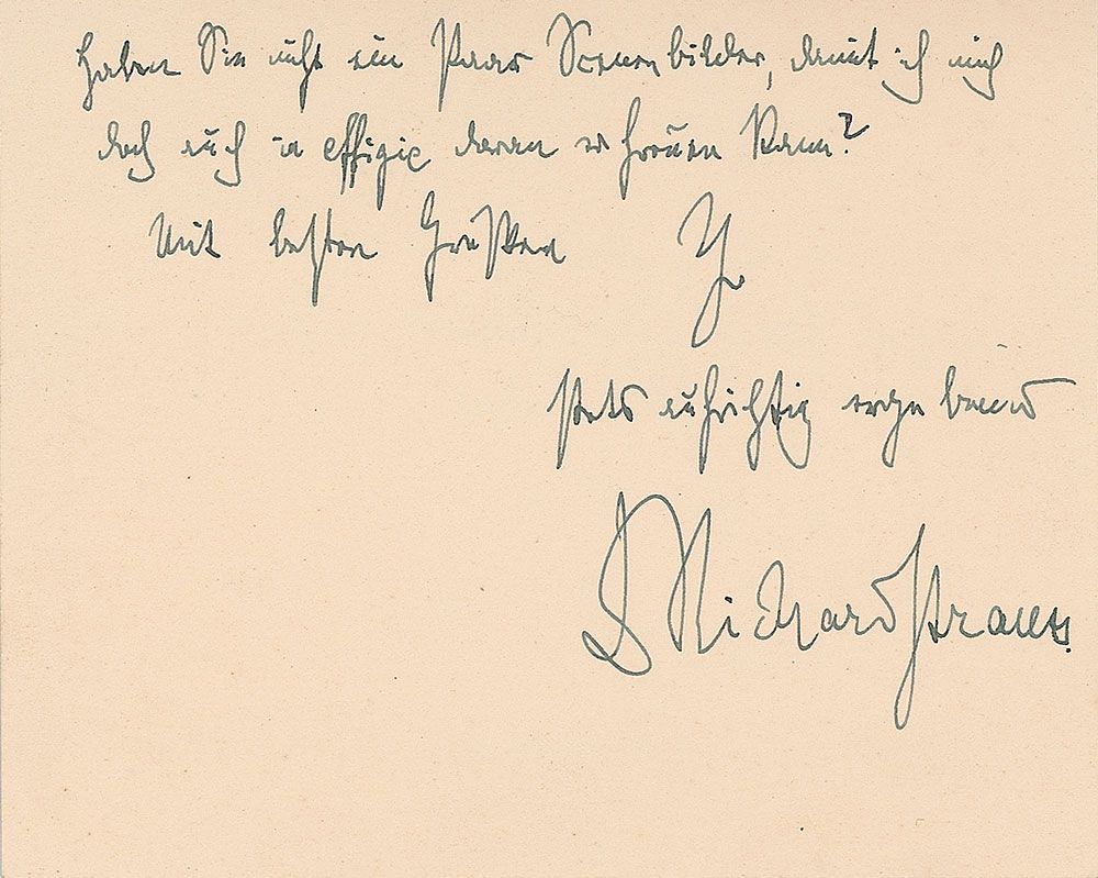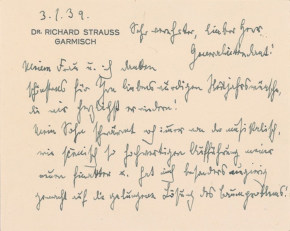 ALS in German, one page both sides, 4.5 x 3.5, personal letterhead, January 3, 1939. Letter to Dr. Ulbrich, the General Manager at the Prussian State Theater in Kassel. In full (translated): “Dear Sir and General Manager of the Theater, My wife and I thank you cordially for your kind New Year's wishes, which we hereby return. My son still raves about the performance of my new one-act works, for the high quality of both its musicality as well as its staging, and he had made me particularly curious about the successful solution for the garden of trees. Would you have a few pictures of the staging so that I can take pleasure at least in the representation?” In very fine condition. Accompanied by the original mailing envelope.
