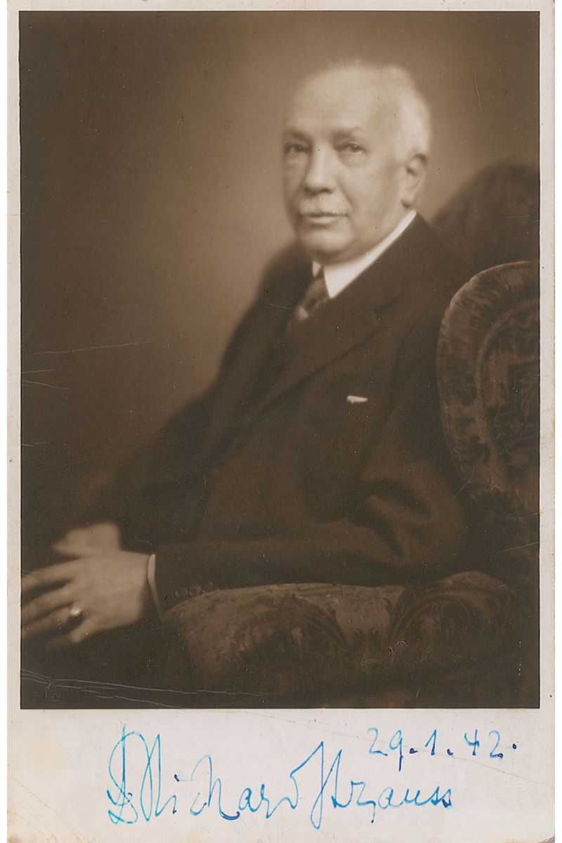 German composer (1864–1949) whose colorful symphonic poems and operas earned him a place among the most important figures in late-19th and early 20th-century music. His best-known work is ‘Also Sprach Zarathustra’ (1896), which attained iconic status as the theme of the film 2001: A Space Odyssey. Distinguished matte-finish 3.25 x 5.25 postcard photo of Strauss seated in an armchair, signed in the lower border in fountain pen, “Richard Strauss, 29.1.42.” Stamped on the reverse by photographer Marie Tschiedel of Vienna. Scattered creases, most noticeably to the bottom, one passing through the date but signature itself unaffected, otherwise fine condition.