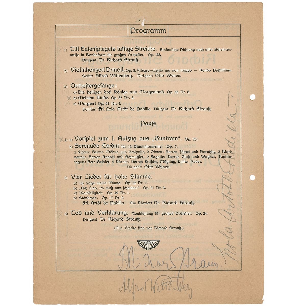 Program for a performance of Strauss’s music, one page both sides, 9 x 12, signed at the conclusion in pencil by Richard Strauss, violinist Alfred Wittenberg, and soprano Lola Artot de Padilla. In very good condition, with a fragile central horizontal fold, scattered creases and edge tears, and two punch holes to one side. Originates from the collection of American violinist and pianist Louis Persinger (1887–1966), who trained at the Leipzig Conservatory and later taught at Juilliard, mentoring the likes of Yehudi Menuhin, Ruggiero Ricci, and Isaac Stern.