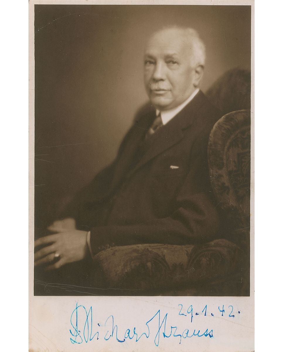 German composer (1864–1949) whose colorful symphonic poems and operas earned him a place among the most important figures in late-19th and early 20th-century music. His best-known work is ‘Also Sprach Zarathustra’ (1896), which attained iconic status as the theme of the film 2001: A Space Odyssey. German postcard photo, 3.25 x 5.25, signed in the lower border in blue ink, “Dr. Richard Strauss, 29.1.42.” Some scattered creases, mainly to lower border, a couple passing through the date, otherwise fine condition.