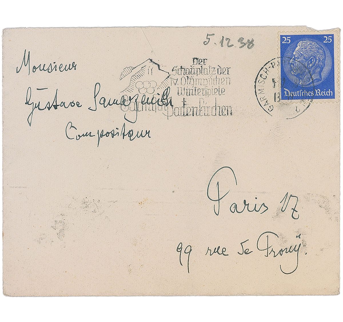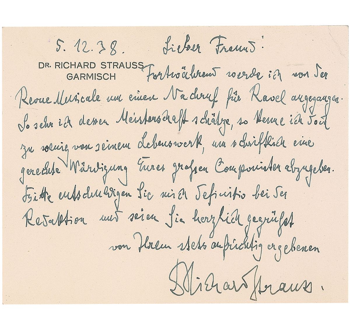 ALS in German, signed, “Dr. Richard Strauss,” one page, 4.5 x 3.5, personal letterhead, December 5, 1938. Letter to composer Gustave Samarzenich. In part (translated): “I am continually addressed by the Revue Musicale to write an obituary for Ravel. But as much as I appreciate his mastership, I simply know too little of his life’s work to write an adequate appraisal of your great composer.” In fine condition. Accompanied by the original mailing envelope.