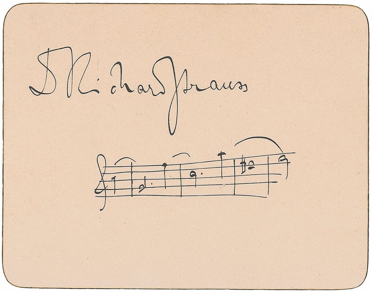 German composer (1864–1949) whose colorful symphonic poems and operas earned him a place among the most important figures in late-19th and early 20th-century music. His best-known work is ‘Also Sprach Zarathustra’ (1896), which attained iconic status as the theme of the film 2001: A Space Odyssey. AMQS on an off-white 4.5 x 3.25 card. Strauss pens five bars of music from an unidentified work, signing above the quote, “D Richard Strauss.” In fine condition.