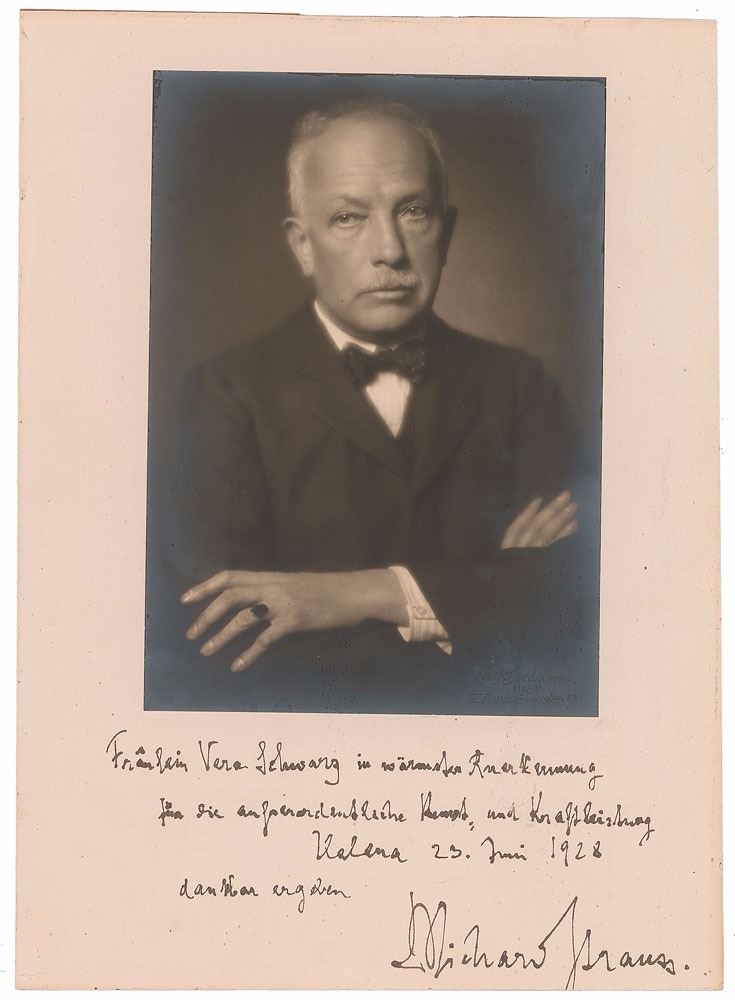 Vintage matte-finish 5.75 x 8.25 portrait of Strauss by Edith Barakovich of Vienna, Austria, affixed to the original 9 x 12.5 studio mount, signed and inscribed on the mount in fountain pen to Austrian soprano Vera Schwarz, with Strauss adding the date, "23. Juin 1928." In fine condition, with trimmed borders, light silvering, and surface loss within the inscription not affecting anything.