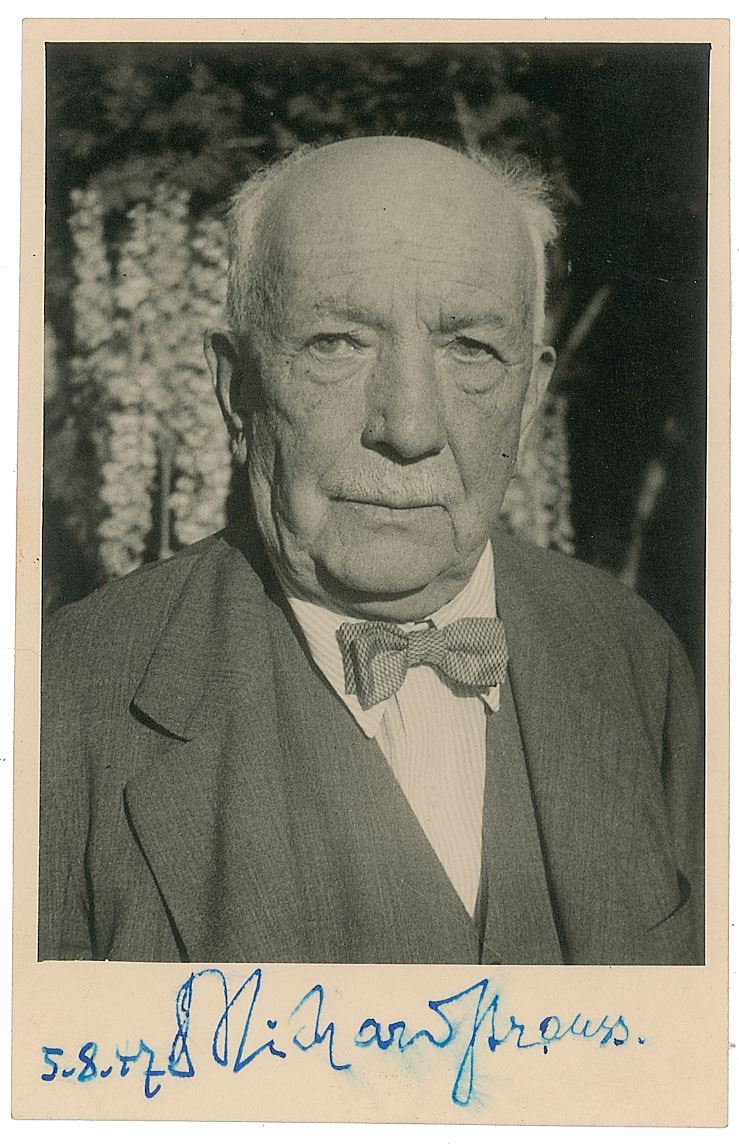Excellent matte-finish 3.5 x 5.5 postcard photo of Strauss in a bow tie, signed in the lower border in fountain pen, "Richard Strauss, 5.8.47." In fine condition, with light brushing to the signature.