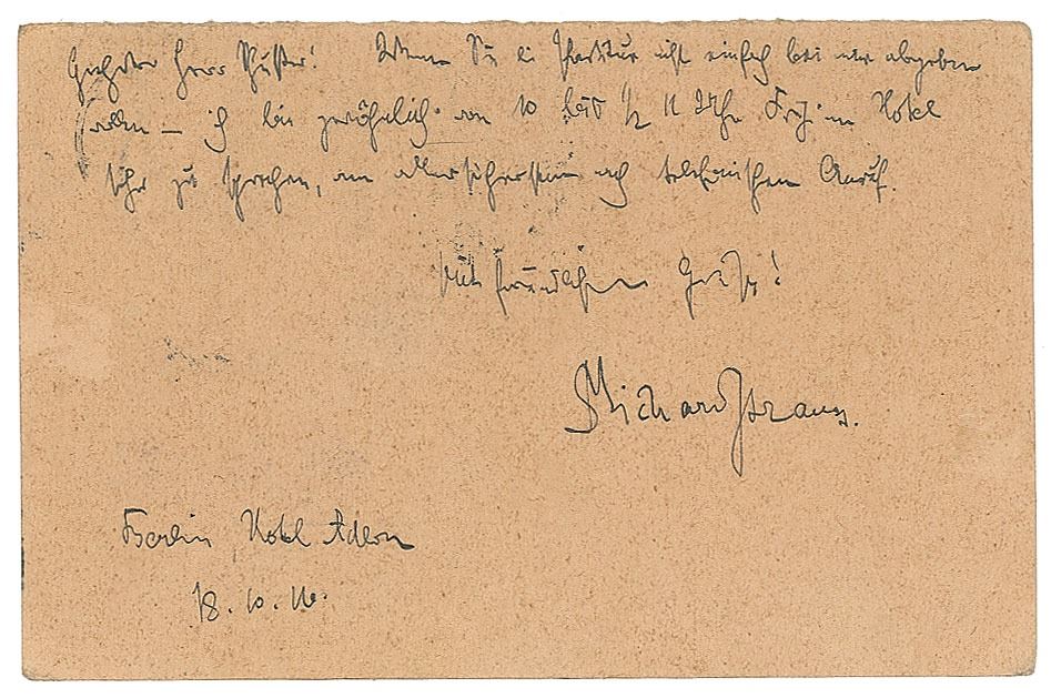 Two ALSs in German, each one page on 5.5 x 3.5 postcards, November 19, 1896 and October 18, 1916. The first, to publisher Schuster & Loeffler, in part (translated): "Who is, Mr. Bernhard Schuster? The man has a lot of talent! Receive my warmest thanks for sending the interesting 3 songs!" The second, to Bernhard Schuster, in part (translated): "If you don't want to just hand over the score to me—I am usually safe to speak from 10 a.m. to 11:30 a.m. in the hotel." In very good to fine condition, with slightly irregular toning to both and clipped corners and a punch hole to the earlier letter.