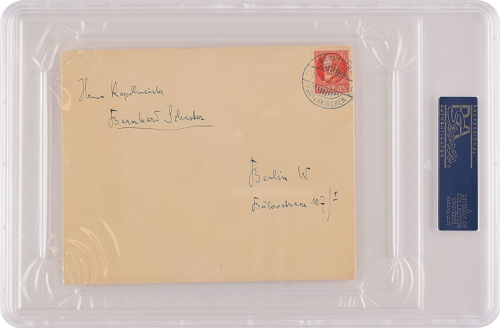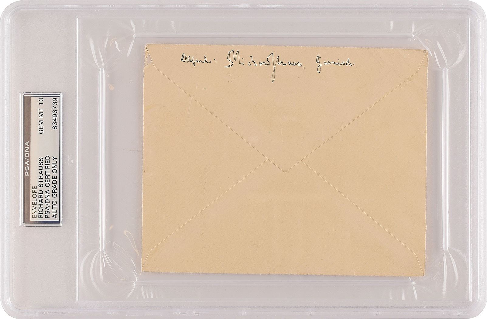 Hand-addressed mailing envelope, 5.75 x 4.75, addressed by Strauss to a gentleman in Berlin, signed in the return address on the flap, "Richard Strauss, Garmisch." In fine condition. Encapsulated in a PSA/DNA authentication holder.