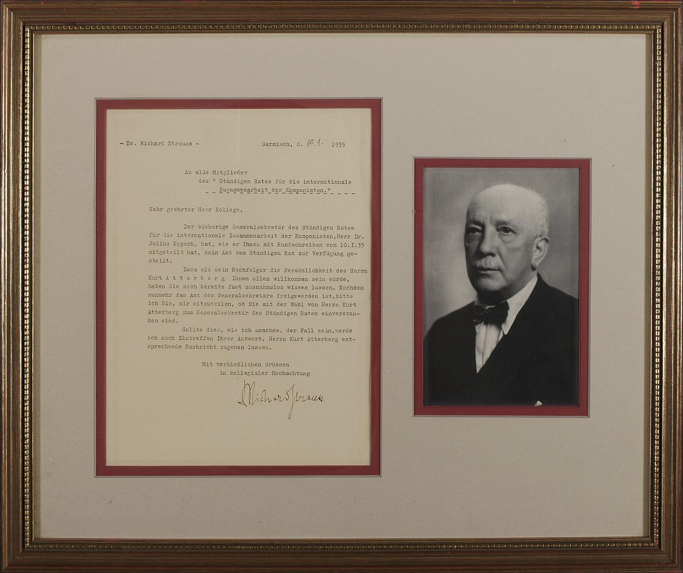 German composer (1864–1949) whose colorful symphonic poems and operas earned him a place among the most important figures in late-19th- and early-20th-century music. His best-known work is Also sprach Zarathustra (1896), which attained iconic status as the theme of the film 2001: A Space Odyssey. TLS in German, one page, 7.75 x 10.5, personal letterhead, January 15, 1935. Untranslated letter concerning the Permanent Council for International Cooperation of the Composers, signed at the conclusion in black ink by Strauss. Double matted and framed to an overall size of 20 x 16.75. In fine condition, with central horizontal and vertical folds, and a few wrinkles. Pre-certified PSA/DNA and RRAuction COA.