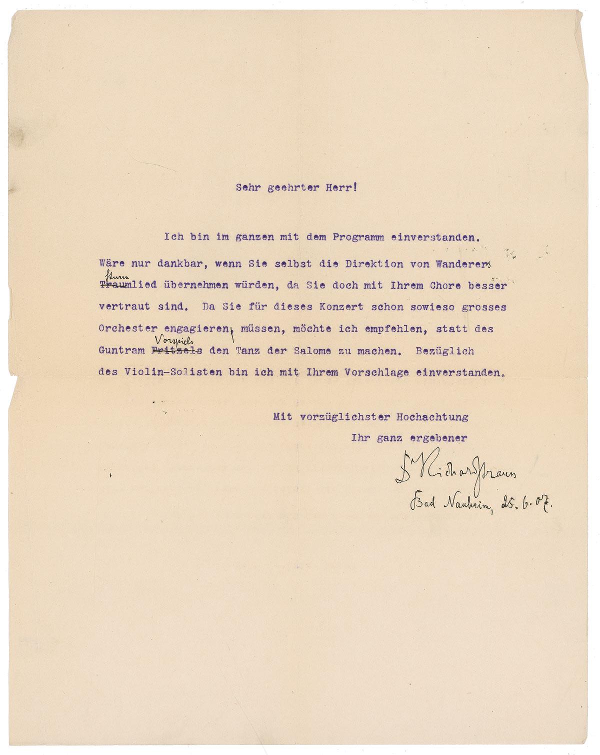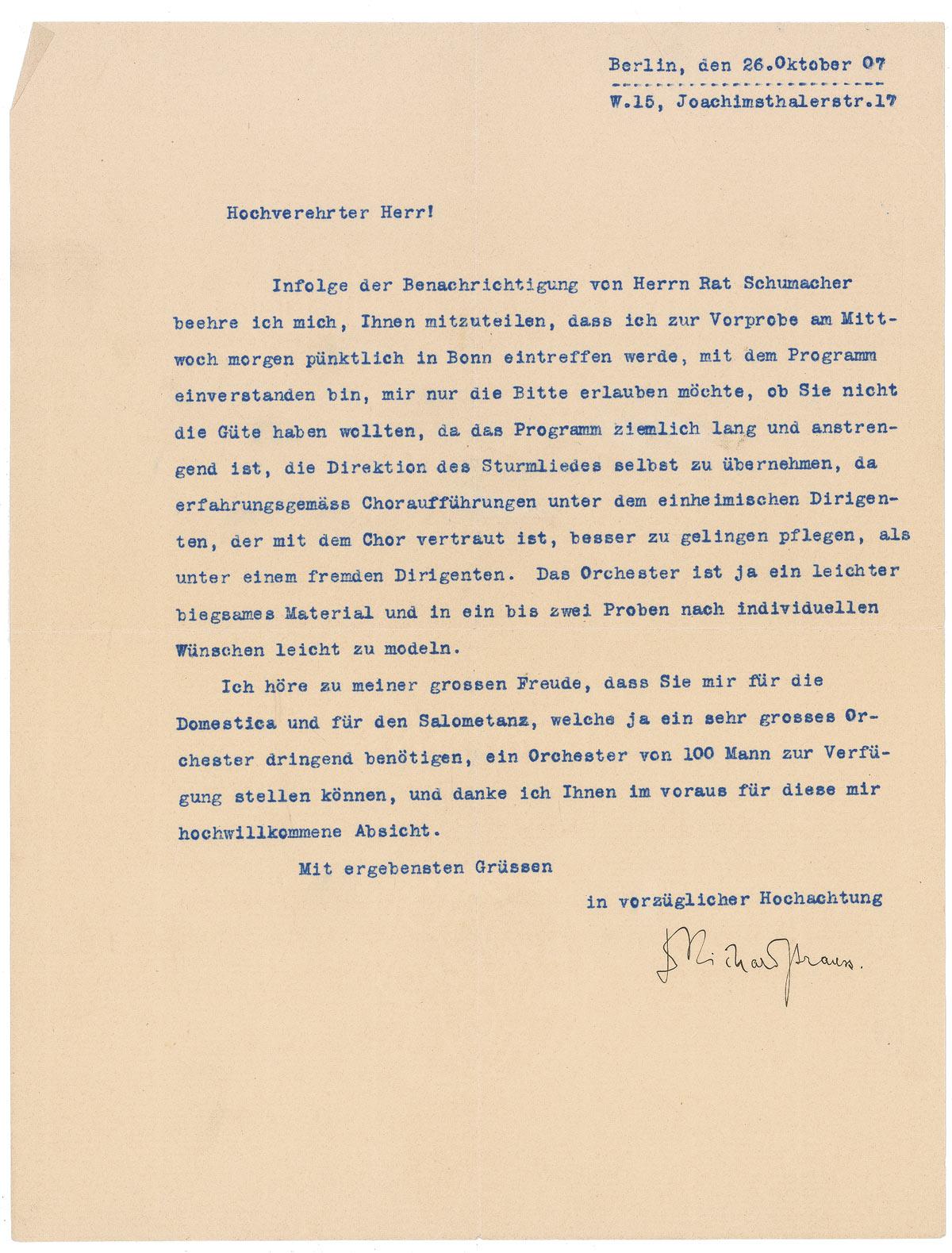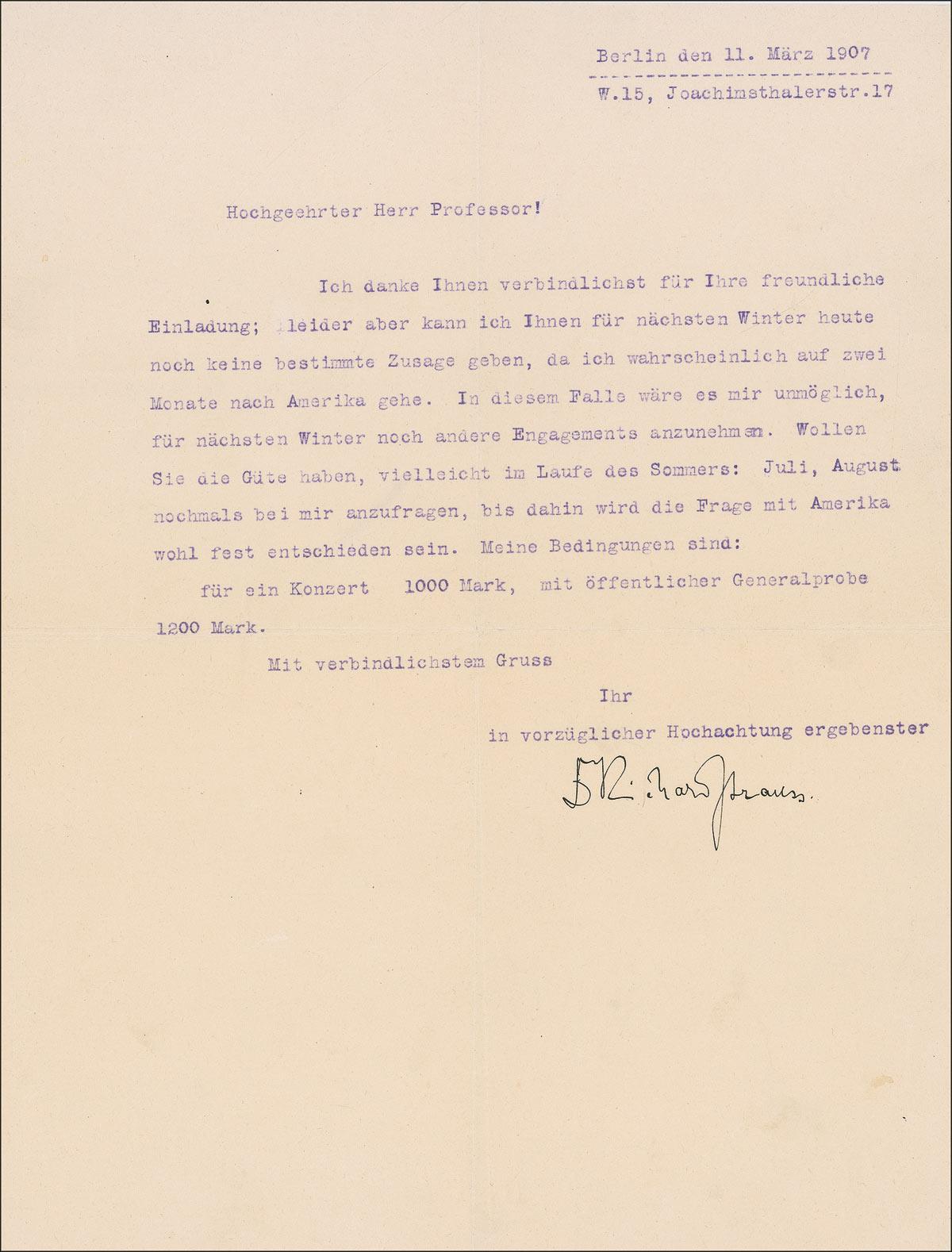 Three TLSs in German, each one page, 8 x 11, each dated 1907. Sent to composer and conductor Hugo Gruters. According to our consignor, the untranslated text makes arrangements for concerts in Bonn, Germany. In a March letter, Strauss says he cannot commit himself for the winter due to a possible trip to America, but he identifies his rate of 1,200 German Marks; a June letter discusses the plan in detail, including Strauss’ suggestion that Gruters conduct the Wandrers Sturmleid, because he is more familiar with the chorus, and also that because of the size of the orchestra it would be better to replace the Guntram overture with the Dance of Salome; and an October letter confirms the details, repeats his suggestion about the conducting of the Sturmlied because of the difficulty of rehearsing the chorus, and expresses delight that a large orchestra is available for the Domestica and the Dance of Salome. In overall very good condition, with intersecting folds and mild to moderate creasing, more pronounced on the second and third examples.