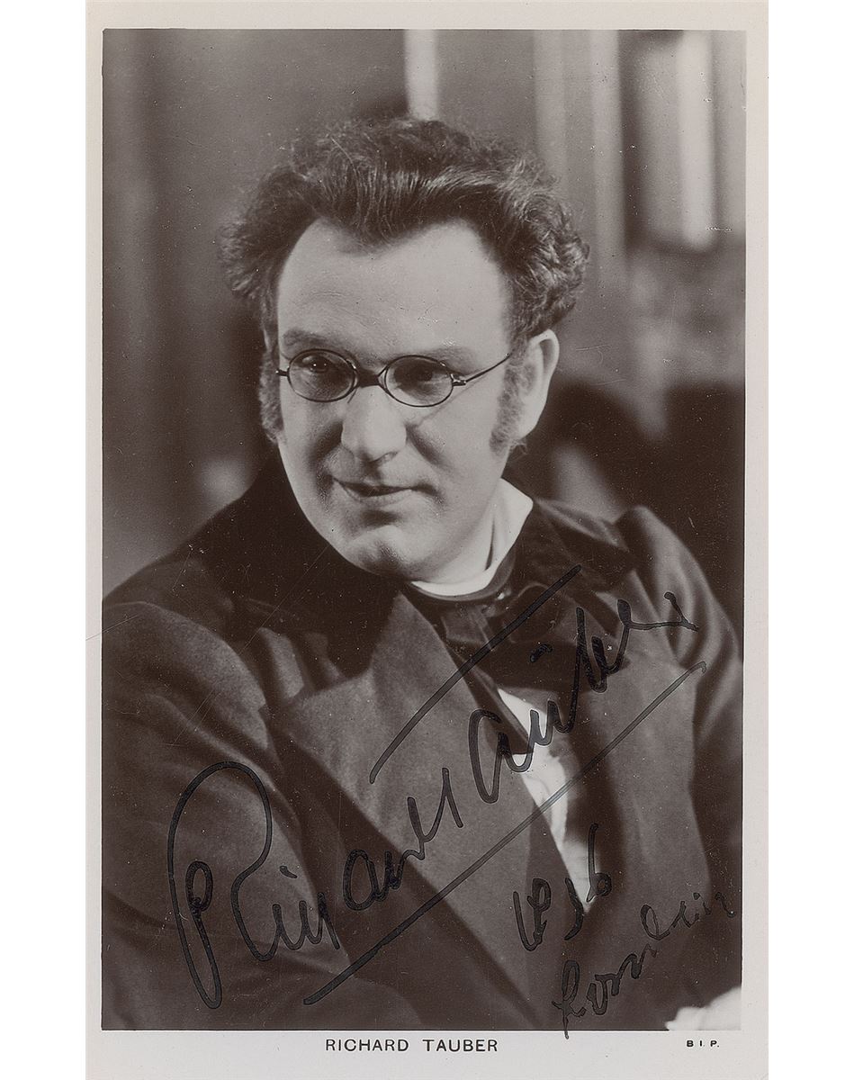 Austrian tenor (1891–1948). Glossy 3.5 x 5.5 signed postcard photograph of Tauber, signed in black felt tip, “Richard Tauber, 1956, London.” In fine condition, with moderate contrast to the signature against his dark suit.