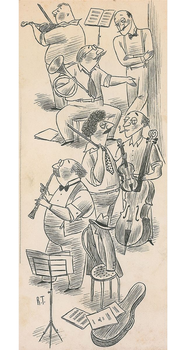Original ink sketch of musicians on an off-white 4.25 x 10 card, signed in the lower left, “R. T.” Reverse bears numerous production marks and notations, including a New Yorker Editorial Department stamp. Affixed at the top to a slightly larger sheet. Mild scattered foxing and slight rippling to top, otherwise fine condition.