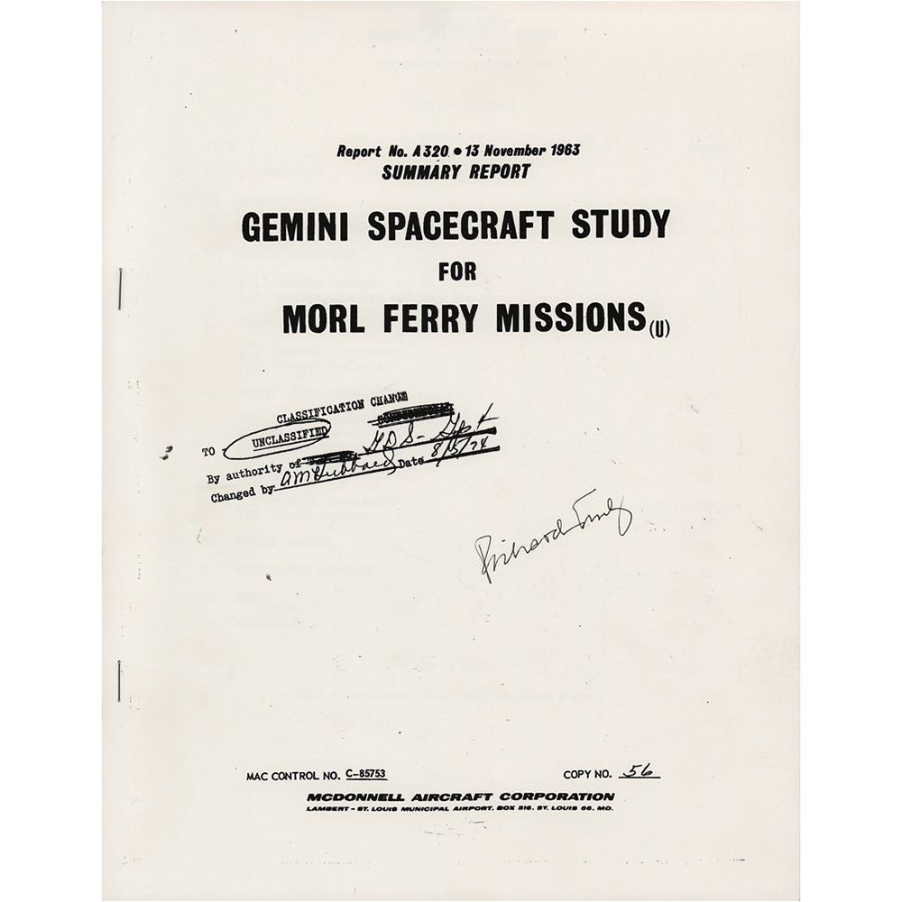 Staple-bound reproduction of a declassified NASA summary report entitled ‰ÛÏGemini Spacecraft Study for MORL Ferry Missions,‰Û dated November 13, 1963, Copy No. 56, prepared by the McDonnell Aircraft Corporation, 8.5 x 11, 29 pages, signed on the front cover in black ink by Richard Truly, who was among the first military astronauts selected to the United States Air Force's Manned Orbiting Laboratory (MOL) program. The manual contains 11 sections: Introduction, MORL Mission, Gemini Applications, Design Parameters, Ferry Spacecraft, Ferry/Supply Spacecraft, Unmanned Supply Spacecraft, Weight Margins, Development Schedule, Costs, and References. In fine condition.