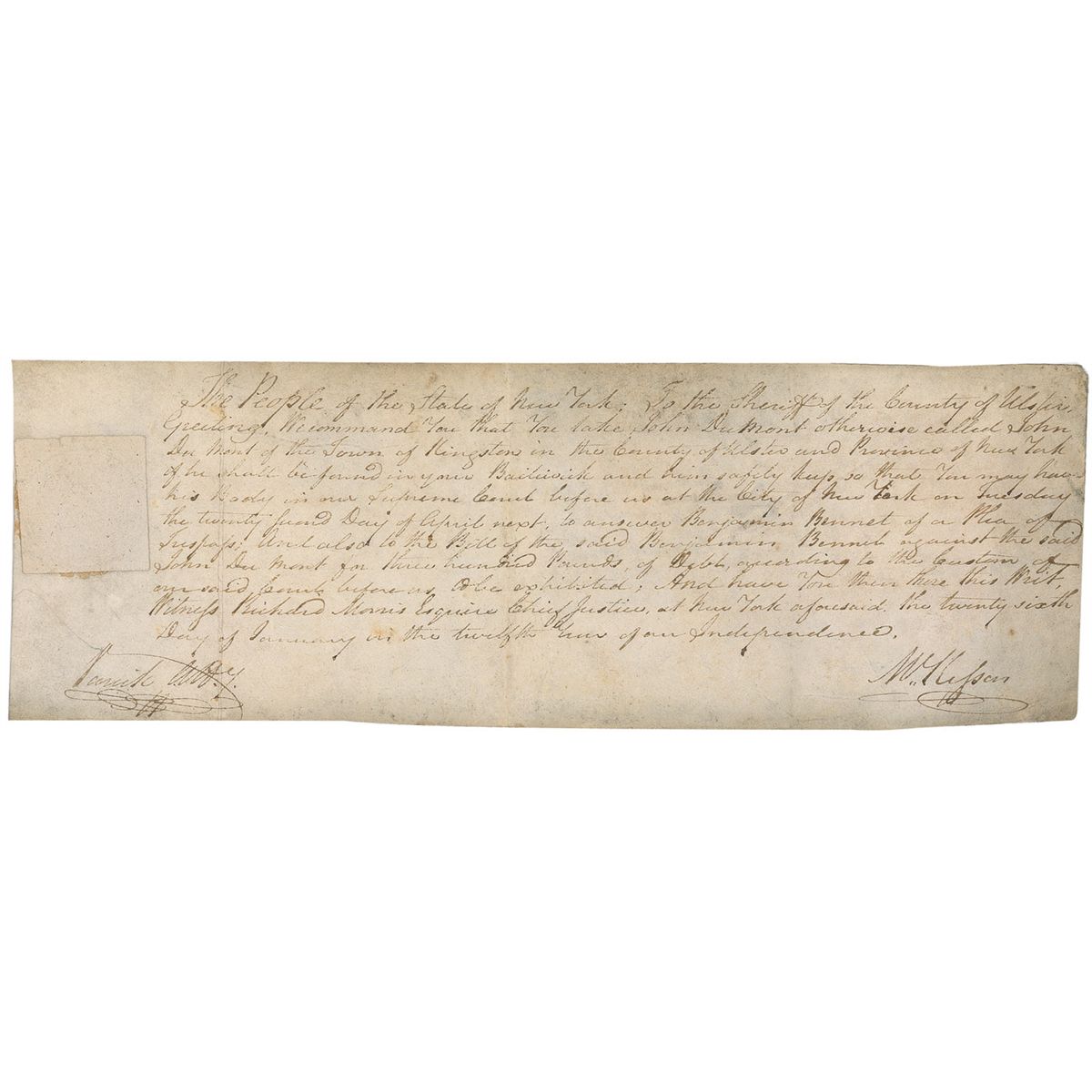 American soldier and statesman (1753–1831) who was aide-de-camp to Benedict Arnold prior to the latter’s defection to the British. Varick later served as Washington’s private secretary, mayor of New York, and a New York state legislator. Vellum manuscript DS, one page, 10.5 x 3.5, January 26, 1778. A document concerning a summons to court: “We command You that You take John Dumont...in our Supreme Court before us at the City of New York...to answer Benjamin Bennet of a Plea of Trespass...,” signed by Varick at the conclusion, “Varick, Atty,” and again on the reverse. White seal is in tact. In very good condition, with three vertical folds, one affecting the end of the signature, heavy toning, and trimmed edges.