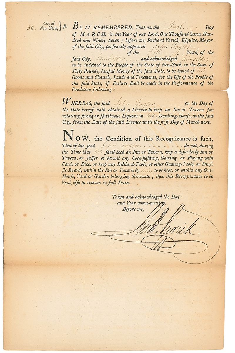 American soldier and statesman (1753–1831) who was aide-de-camp to Benedict Arnold prior to the latter’s defection to the British. Varick later served as Washington’s private secretary, mayor of New York, and a New York state legislator. Partly-printed DS, signed “Rich Varick,” one page, 8 x 12.5, March 1, 1797. License approval for John Taylor to keep an Inn or Tavern for retailing liquor. During that time, he will “not keep a disorderly Inn or Tavern…or permit any Cock-Fighting, Gaming or Playing with Cards or Dice, or keep any Billiard table.” In fine condition, with slight separations along horizontal folds and some scattered light toning.