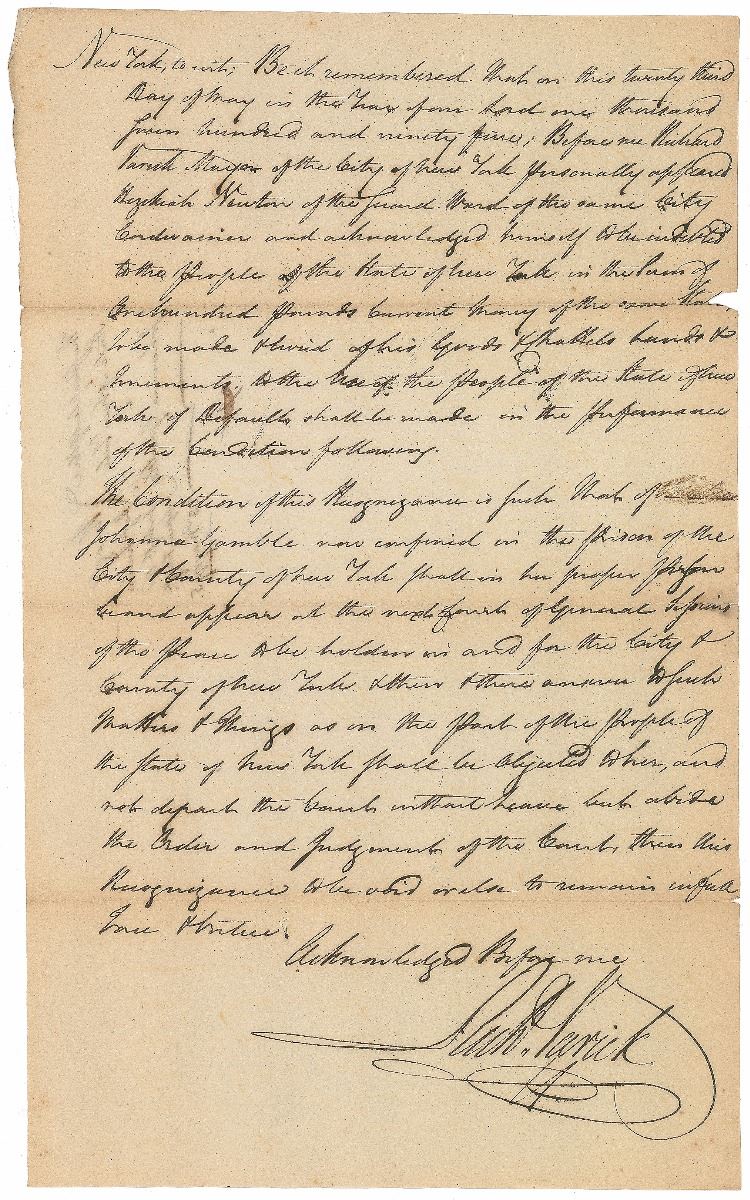 American soldier and statesman (1753–1831) who was aide-de-camp to Benedict Arnold prior to the latter’s defection to the British. Varick later served as Washington’s private secretary, mayor of New York, and a New York state legislator. Manuscript DS, signed “Rich’d Varick,” one page, 7.75 x 12.75, May 23, 1795. Document concerning bail in the case of the State of New York vs. Johanna Gamble, issued as mayor of New York City. In fine condition, with slight splitting and paper loss along folds.